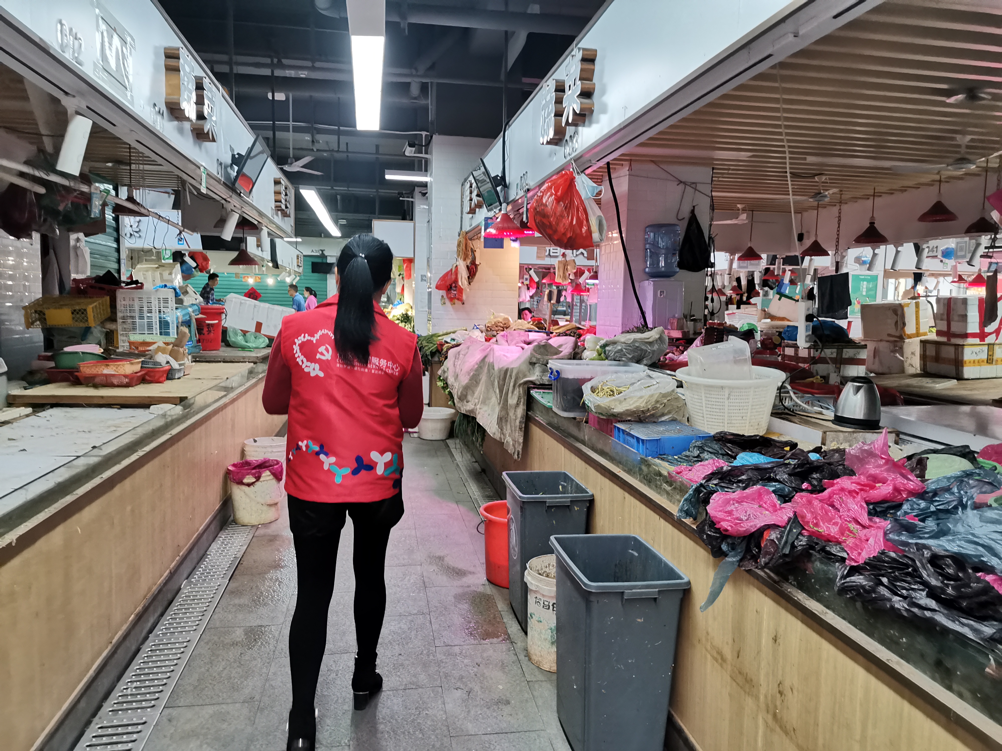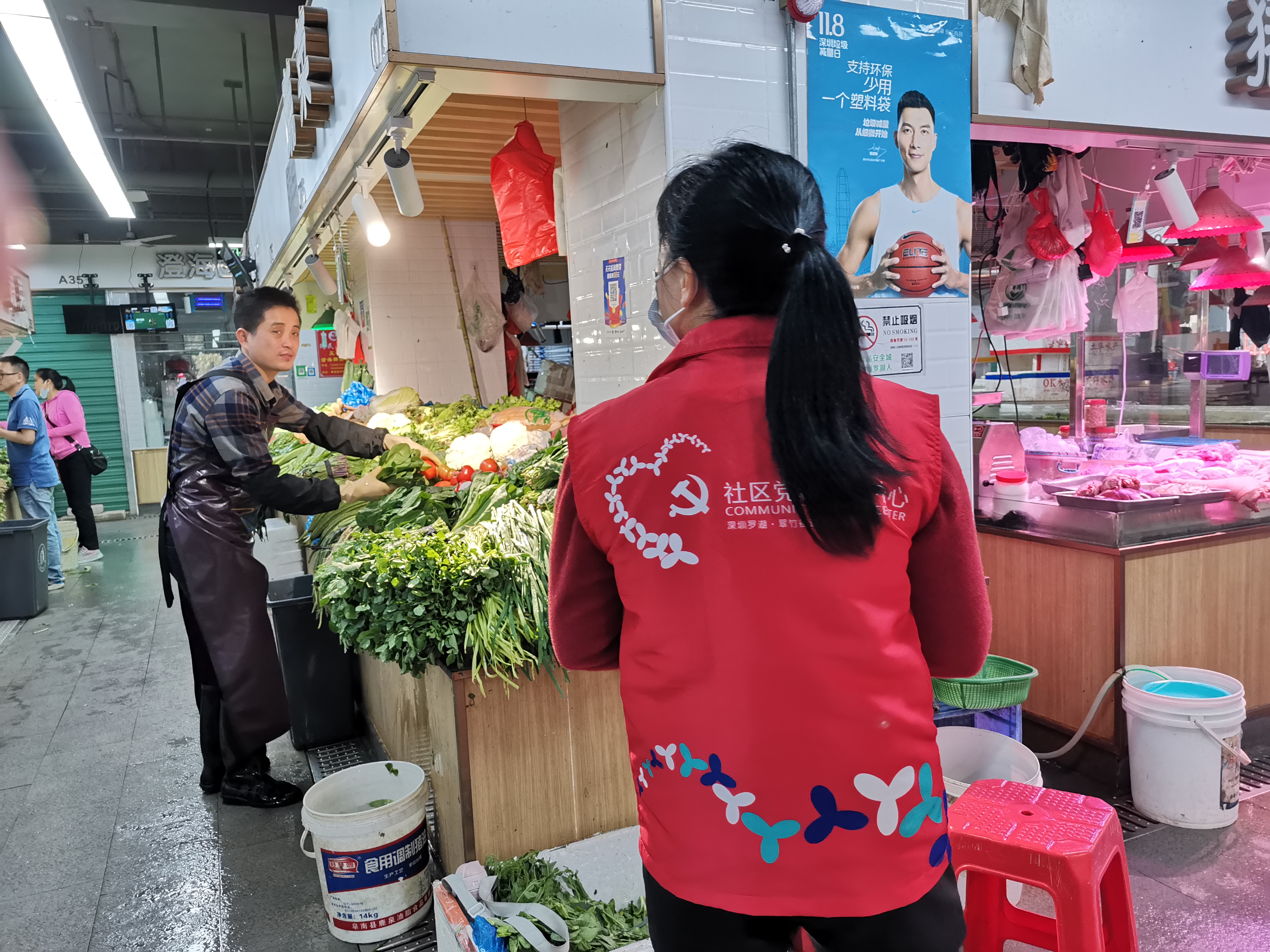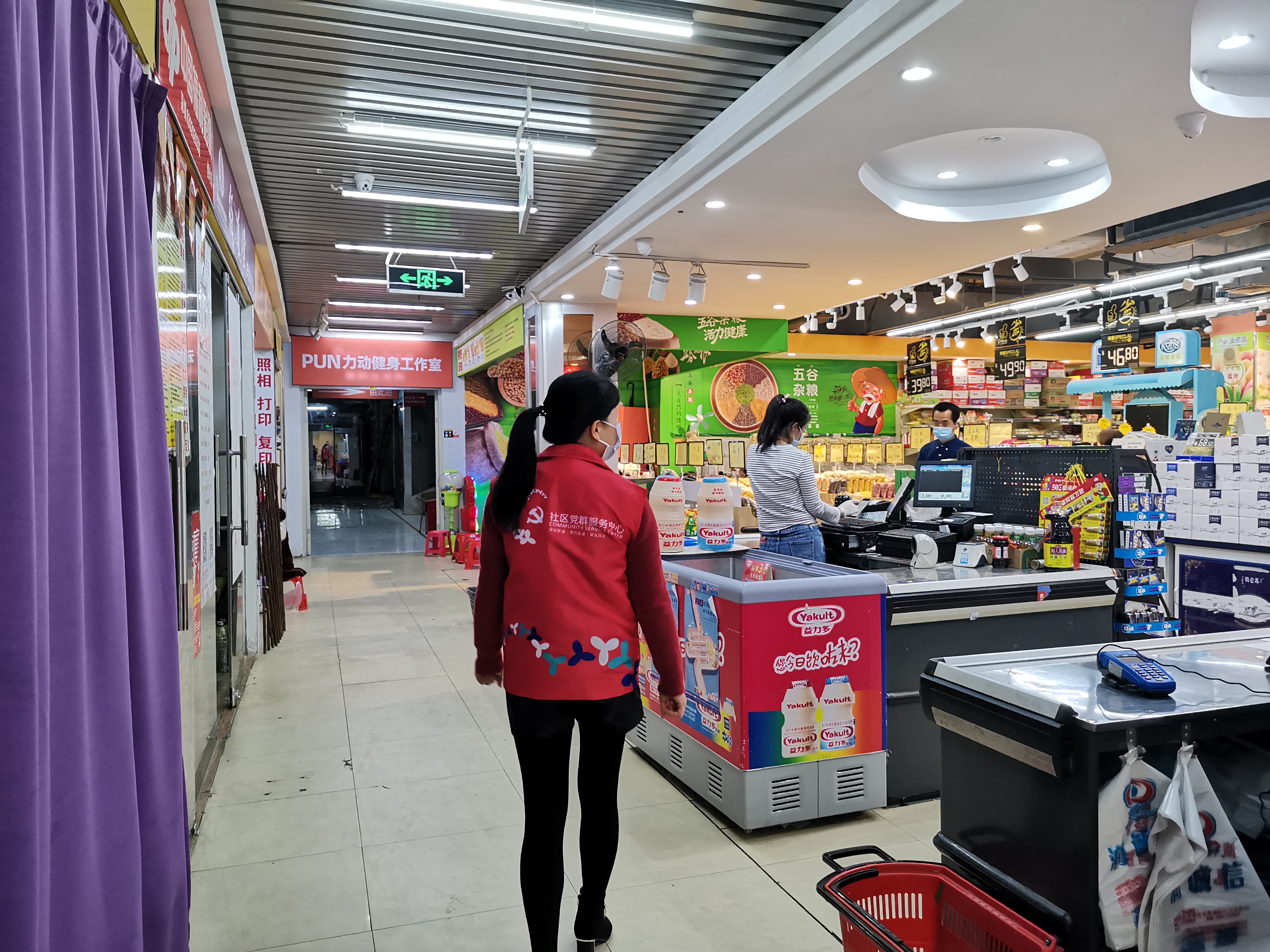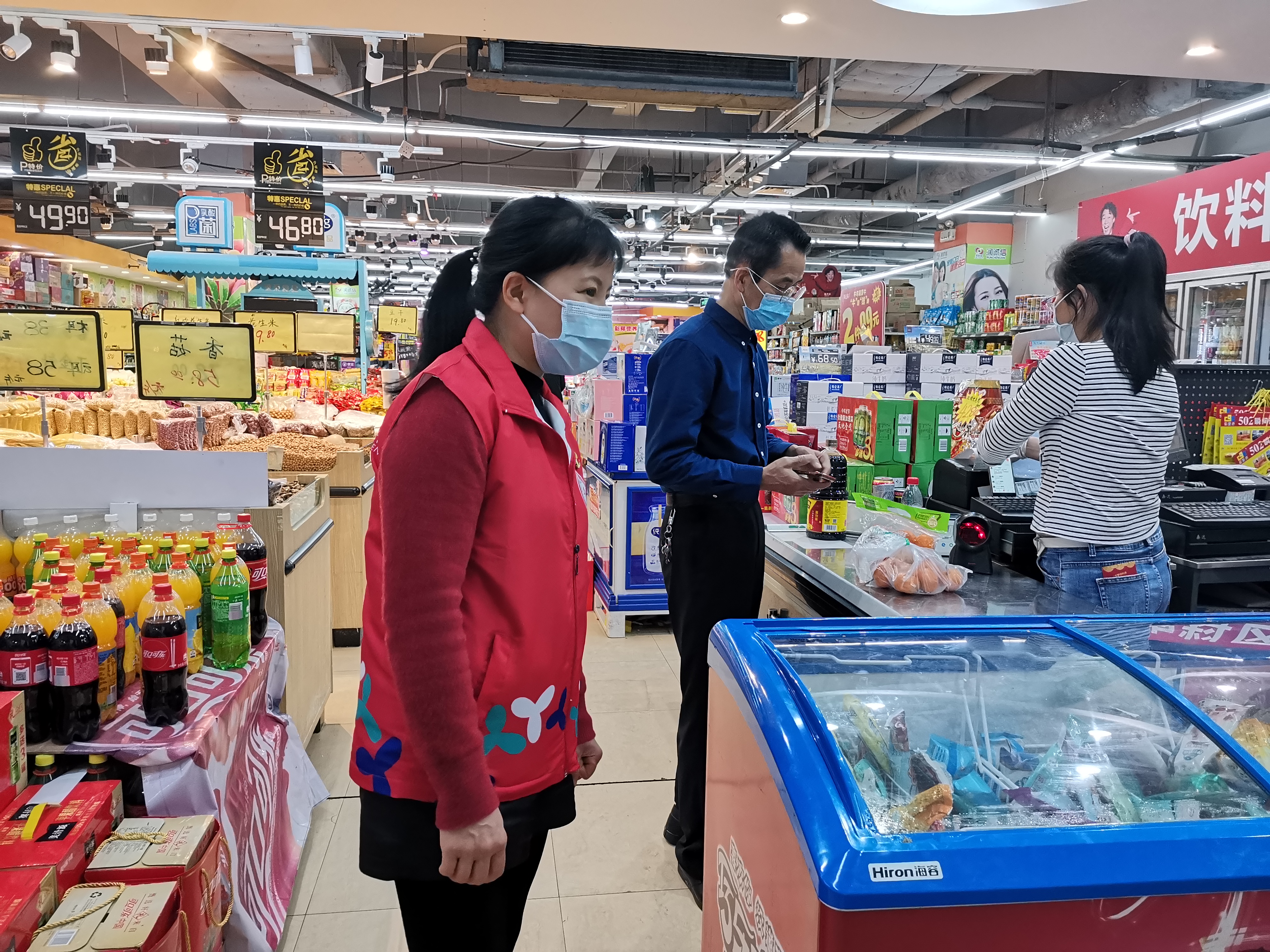 2021年2月14日,翠达社区工作人员对东晓市场,润诚信超市进行巡查。