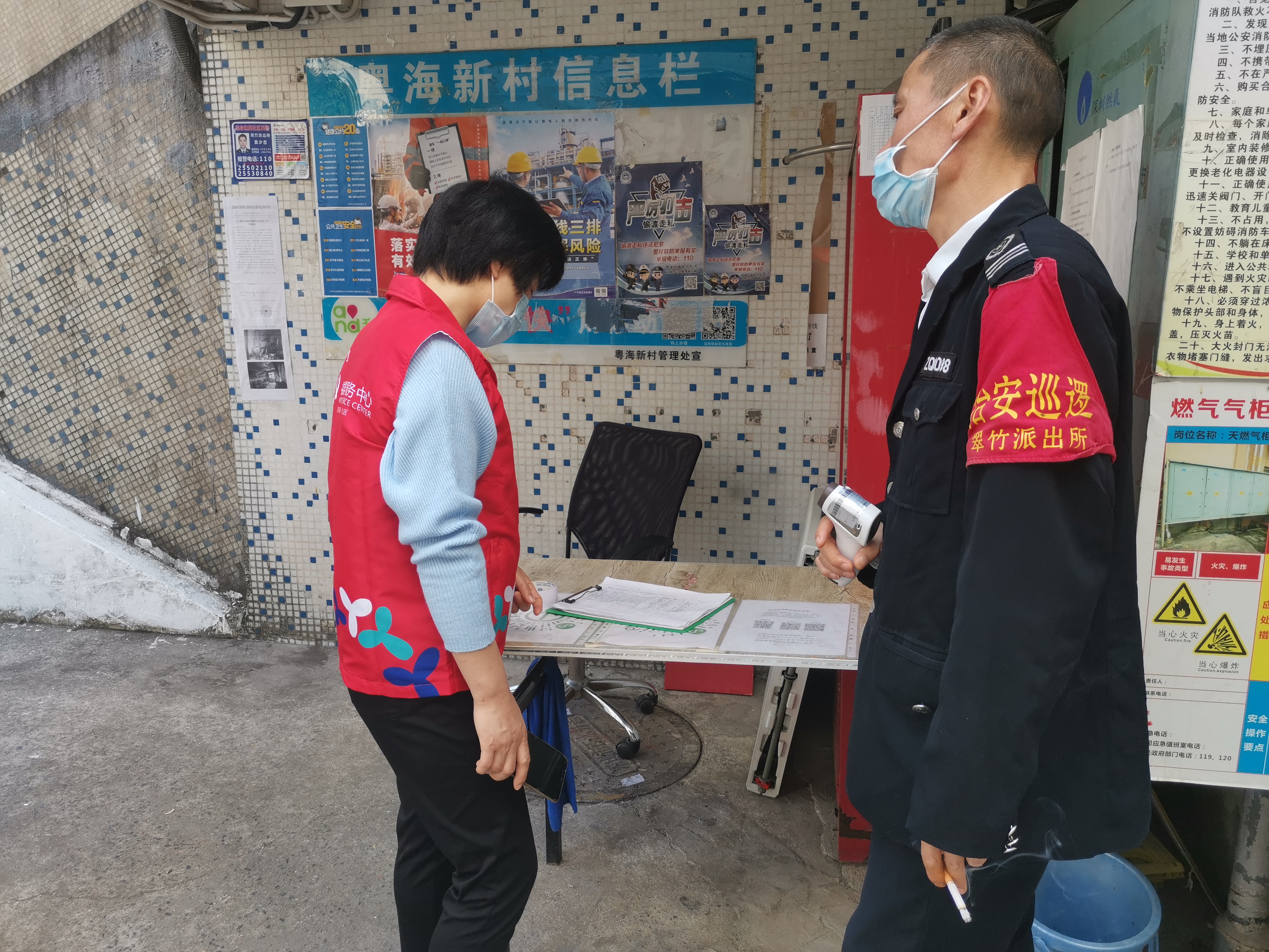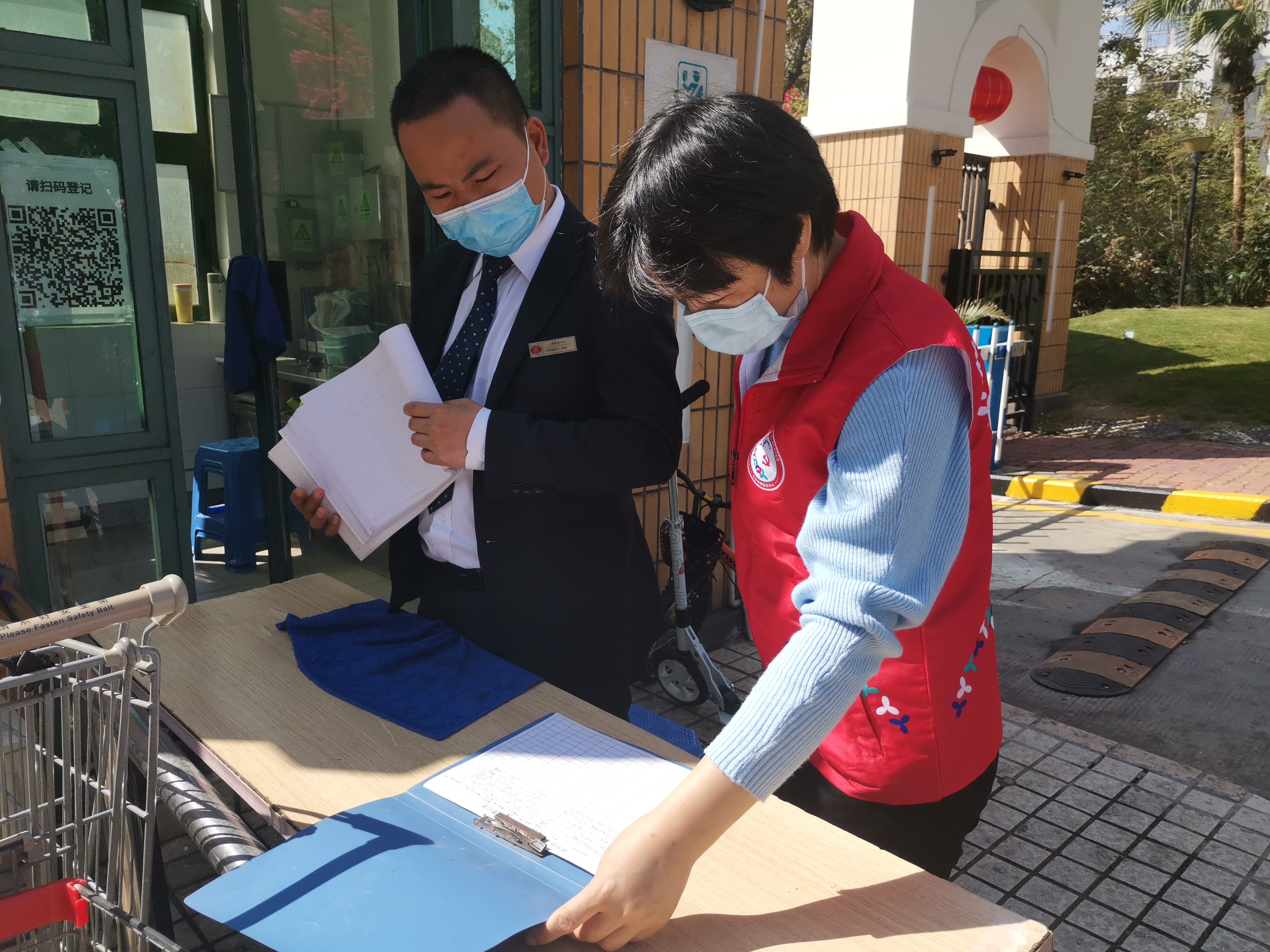 2021年2月15日,翠达社区工作人员对各小区花园的卡口安全防疫工作进行巡查。