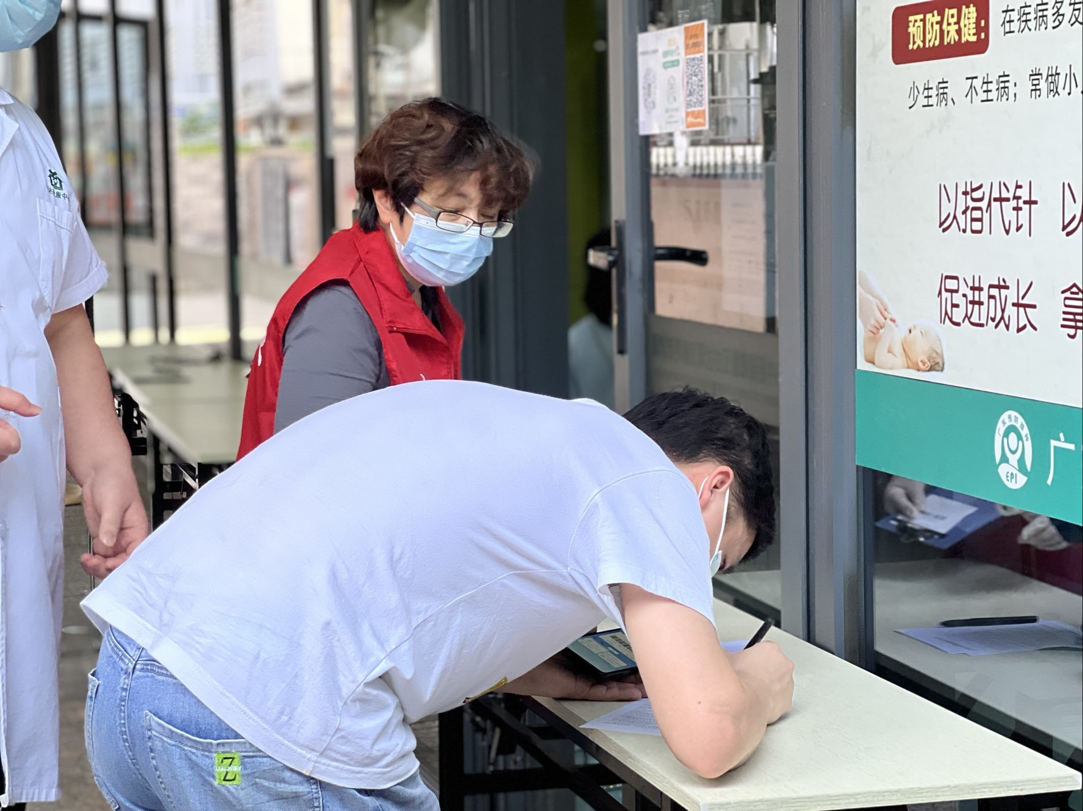 2022年4月8日,翠达社区义工助力社康新冠疫苗接种工作。现场指导前来接种的居民扫码登记、填写表单等。