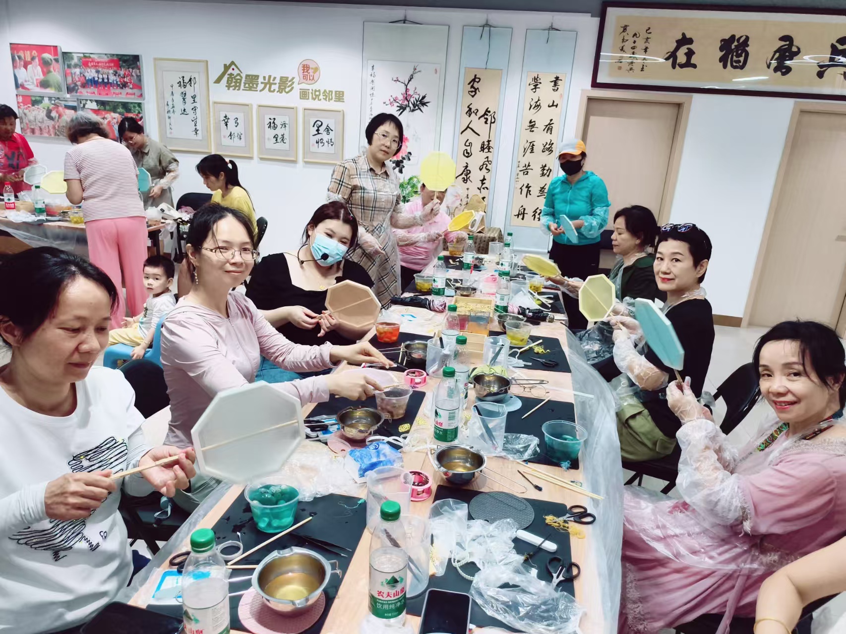 在老师的耐心指导下,居民们开始动手制作属于自己的蚕丝扇。大家小心翼翼地将蚕丝铺设在扇面上,轻轻按压,让蚕丝与扇骨紧密贴合。经过一番努力,一把把精美的纯色蚕丝扇逐渐成型,居民们看着自己的作品,脸上洋溢着成就感和喜悦。