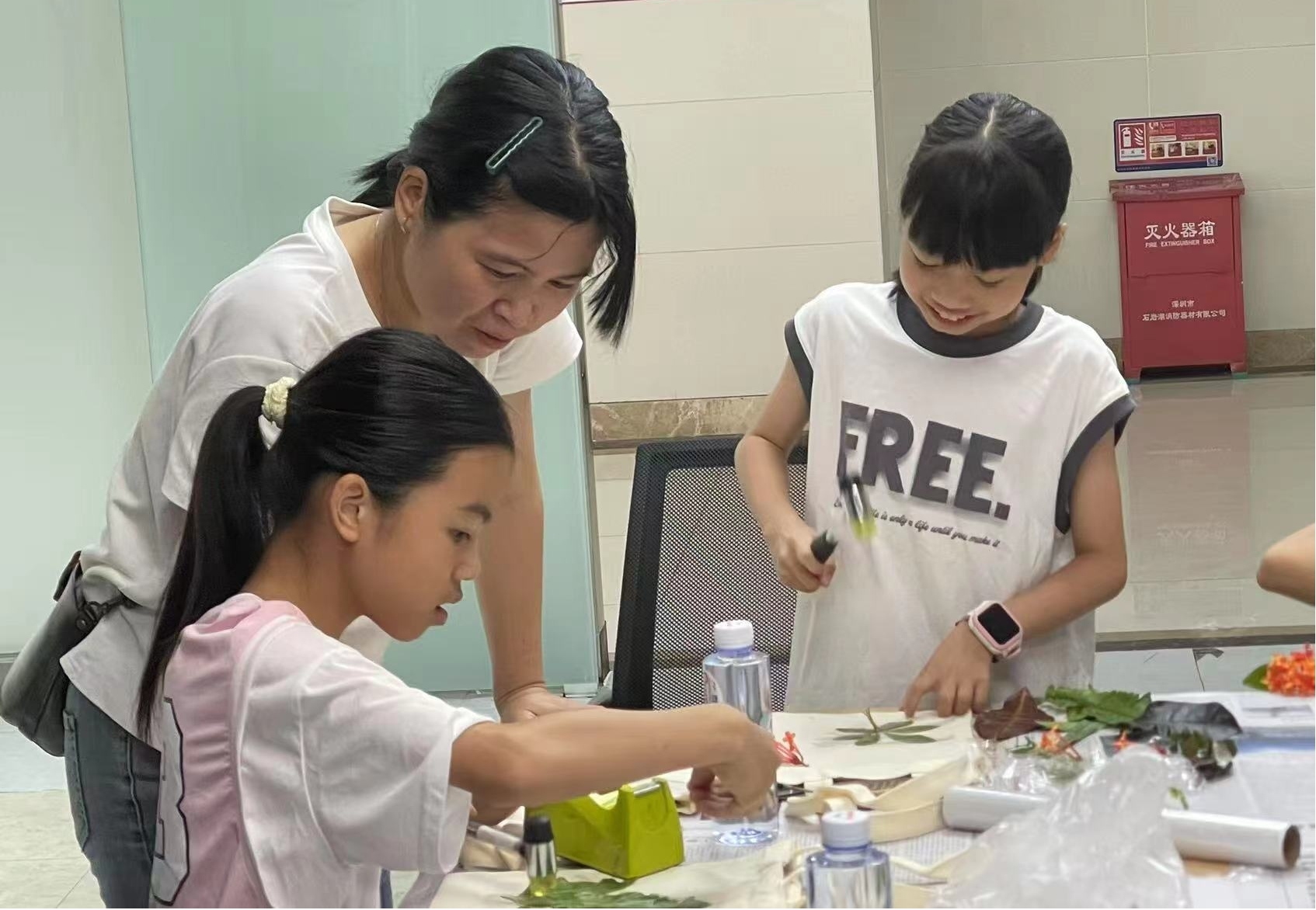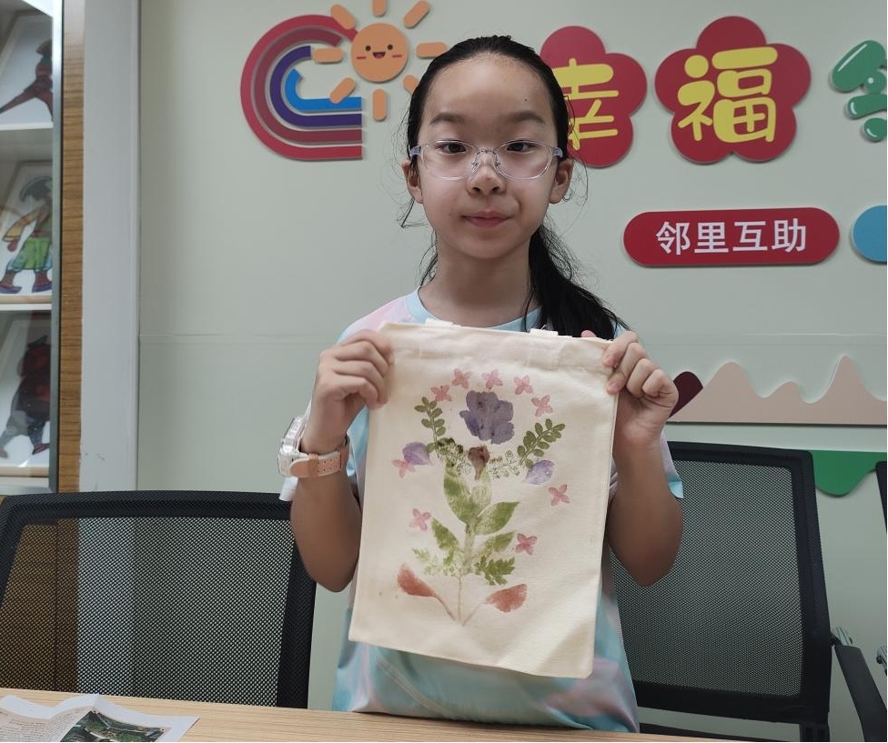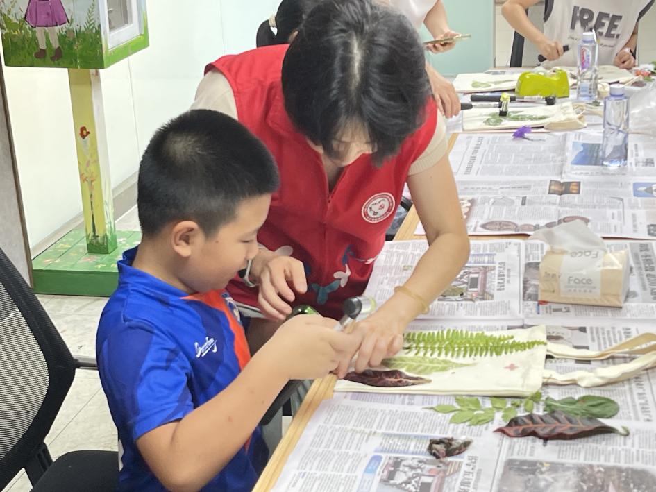 在实操环节,亲子家庭默契配合,共同挑选形状各异的叶片、娇艳的花朵,摆放植物、均匀敲打……孩子们化身“小艺术家”,小心翼翼地将植物纹理拓印在帆布包上;家长们则在一旁耐心协助,适时给予鼓励,现场气氛温馨而热烈。一片片普通的树叶,在亲子协作下,变成了独一无二的艺术作品。