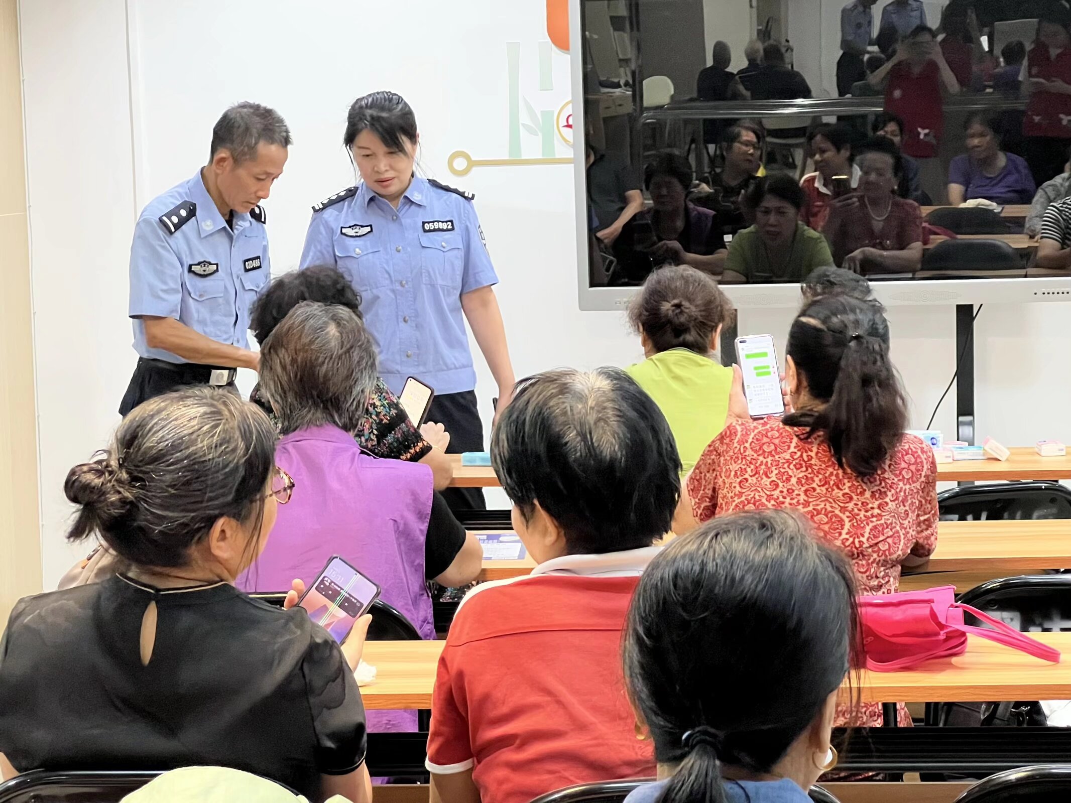 辖区派出所民警曾警官和麦警官结合近年来发生的真实案例,以‘案例讲解 + 风险提示’的形式,生动剖析了当前针对老年人的诈骗新动向、新套路。“大家一定要记住,凡是声称‘投资回报率超高的,基本都是骗局。’曾警官通过情景模拟等方式,详细讲解了诈骗分子如何利用网络将款项快速转向境外、洗钱的多种方式;还现场演示了如何识别虚假网站、辨别诈骗电话,以及遇到疑似诈骗时的正确处理步骤。呼吁参与者:不轻信、不透露、不转账,及时拨打 110 或联系子女、社区,或是采用最快速的做法:第一步拔出手机电话卡,电话告知银行被骗申请账号管制。