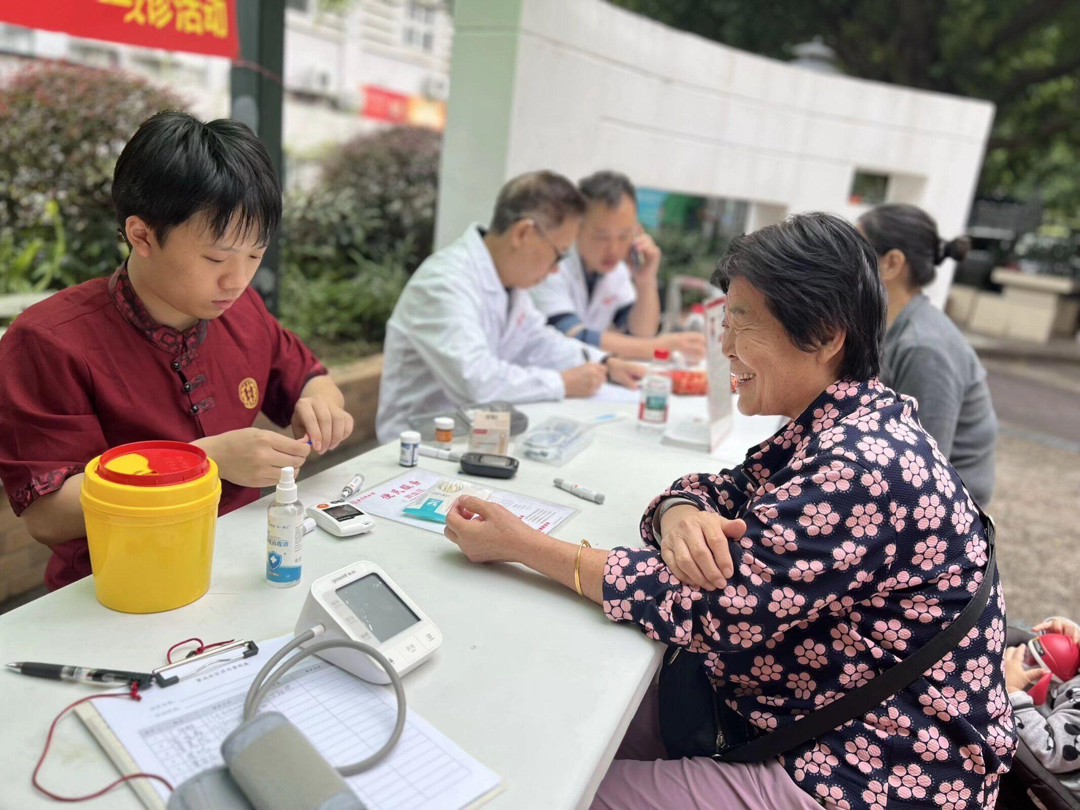 活动现场,医护人员提前做好了充分准备,有序地为居民提供服务。在基础检测区,大家自觉排队,等待测量血糖、血压和尿酸。医护人员耐心细致地操作仪器,记录数据,并及时将结果反馈给居民。针对指标异常的居民,医护人员还当场给出了初步的健康提醒。经验丰富的李道阳医师通过“望、闻、问、切”四诊合参,详细了解居民的身体状况,为每一位居民进行辨证分析,解答了关于失眠、关节疼痛、脾胃虚弱等常见健康问题的疑惑。同时,结合秋季气候特点,医师为居民量身定制了养生建议,从饮食调理、作息安排到运动方式,都提供了具体且实用的指导,并推荐了适合秋季的养生茶饮和穴位按摩方法。