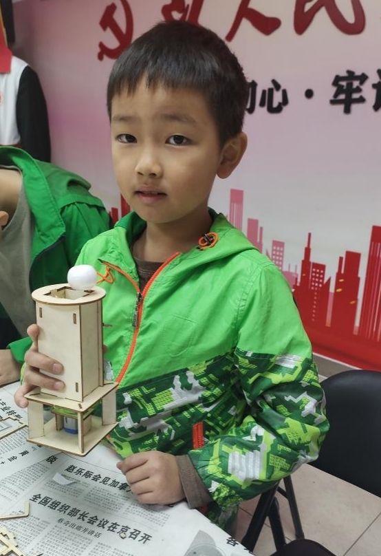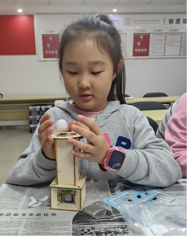 动手制作环节是活动的焦点。孩子们按照示意图,一个步骤一个步骤认真操作,每一个步骤都格外专注。“支架要摆正,不然气流会偏”,“电源线要装对了,不然风往下吹,小球就浮不起来了。”遇到问题时,大家互相请教,互相分享经验。当第一个孩子完成制作,开启开关的瞬间,小球稳稳悬浮在气流上方的时候,现场立刻响起阵阵欢呼。“我成功啦!”小朋友兴奋地展示着自己的作品,脸上洋溢着满满的成就感。“我们也会成功的!”其他小朋友也纷纷表示自己能很快完成作品。
