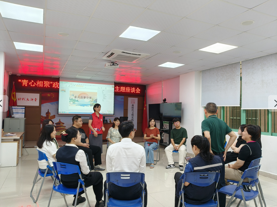 活动伊始,社工先是通过活跃气氛的小游戏,引导企业职工相互认识,了解企业职工的需求,收集意见建议。紧接着,向企业职工讲解关于家风有关的思想,引导大家重视家庭教育,传承良好家风,引导职工树立正确的爱情观、婚姻观、家庭观。随后邀请企业职工分享家风家事、教子经验、婆媳之道、夫妻相处之道等。生活中的一件件平凡琐事,展现了他们在漫长的婚姻生活中,坚守质朴、善良、无私、节俭等传统美德,相濡以沫、互敬互爱携手走过风雨同舟的岁月的美好故事。