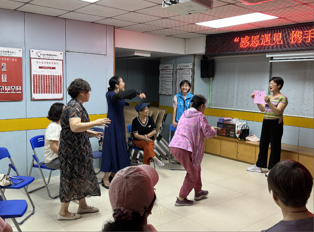 在活动开始前,社工给大家介绍了本次团建活动的目的与活动流程,随后,为了帮助志愿者缓解日常生活中的压力,活动中还特别设置了团体冥想减压环节。在社工的带领下,志愿者们闭上双眼,跟随柔和的音乐和引导语,逐步进入深度放松状态。短短5分钟的冥想时间,让大家感受到前所未有的宁静与舒适。紧接着,社工带领大家开启第一轮破冰游戏“动作小名接龙秀”,志愿者们在这一环节热情高涨。在介绍自己标志性动作时,大家脑洞大开,创意十足,现场氛围轻松愉悦,消除彼此间的陌生感,拉近了彼此间的距离。