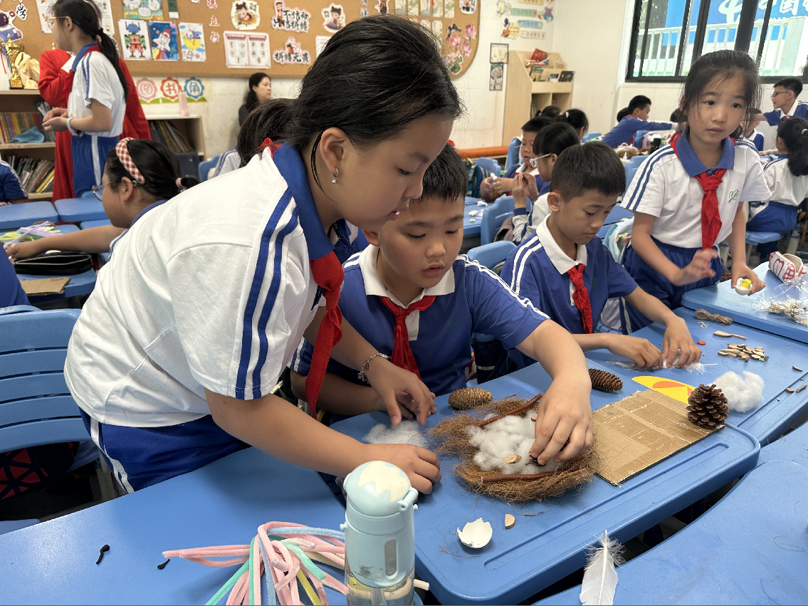 在手工实践环节,社工秉持资源再利用的环保理念,指导同学们利用蛋壳、落叶、棉絮等日常废弃物料,开展创意鸟类作品制作。活动现场,同学们以小组为单位,充分发挥想象力与创造力,将废弃物变废为宝,制作出一件件精美的鸟类手工作品。这种沉浸式的实践体验,不仅让同学们直观感受到环保的魅力,更培养了他们的团队协作精神与创新思维能力。活动尾声,同学们踊跃分享自己的环保心得。有的同学表示要从严格做好垃圾分类做起,有的同学承诺今后要更加注意节约用纸。这些真挚的感悟,体现出此次活动在引导青少年将环保理念转化为实际行动方面取得的显著成效。