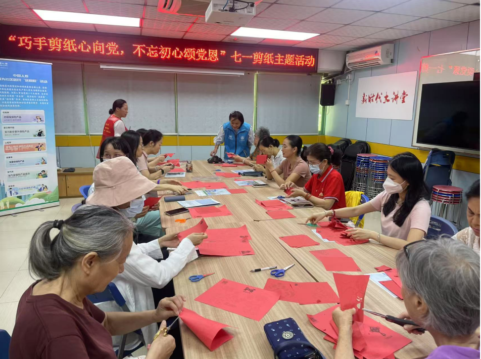 罗湖家园网讯:7月1日上午,在翠岭社区党委的指导下,翠岭社区党群服务中心联合中国人寿洪湖支公司共同开展“巧手剪纸心向党,不忘初心颂党恩”主题剪纸活动。社区居民、党员代表共13余人齐聚一堂,通过红歌传唱、剪纸创作、作品展示等形式,共庆党的生日,献礼党的光辉历程。