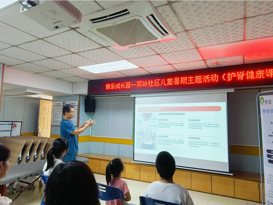 活动现场,张磊祥医生借助PPT图文并茂地讲解了脊柱侧弯的成因、危害及早期识别方法,结合真实案例剖析错误姿势对脊柱的长期影响,提醒家长重视孩子脊柱健康问题。讲座结束后,康复师团队为每位孩子提供了专业脊柱侧弯筛查,并根据评估结果给予个性化检查或训练建议。多位家长表示:“这类专项筛查实用性强,非常及时!”活动最后,张医生带领孩子们学习护脊训练动作,强调日常坚持锻炼的重要性。现场互动踊跃,气氛热烈。