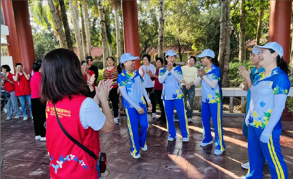 下午 14 时 30 分,大家来到大屏嶂森林公园。大屏嶂森林公园植被茂密、空气清新,是亲近自然、放松身心的好去处。社工带领志愿者玩转 “桃花朵朵开”,欢声笑语此起彼伏;随后的放松互动,让彼此的暖意悄然传递。紧接着,志愿者团队即兴献上舞蹈,灵动舞姿点燃现场氛围,不仅舒缓了徒步疲惫,更将团队的活力与凝聚力展现得淋漓尽致。在公园的观景平台,大家停下脚步,远眺周边的美景,享受着大自然带来的宁静与惬意,疲惫的身心得到了充分的放松。