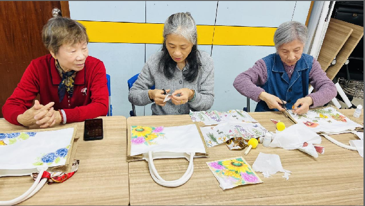 活动现场,五彩斑斓的蝶古巴特(Decoupage)专用纸张、素色帆布包、剪刀、胶水等材料整齐摆放,居民们在社工和志愿者的指导下,开启了一场蝶谷包制作之旅。蝶古巴特艺术源于法国,通过将剪裁的图案拼贴装饰于物品表面,赋予平凡物件独特的艺术生命力。居民们充分发挥创意,有的选取荷花作为核心图案,以展现元宵佳节“出淤泥而不染”的纯净意境;有的大胆尝试,用珊瑚粉、玫红色卡纸剪出火烈鸟的流线型身躯,搭配深紫色羽毛纹理,再以黑色亮片点缀眼睛,瞬间让帆布包变身“热带风情画”;更有的自由发挥,将各种花色图案进行创意混搭。有人用碎花图案纸铺满包身,再剪贴几朵立体郁金香,打造“春日花园”效果,将传统年俗与异域风情巧妙融合。