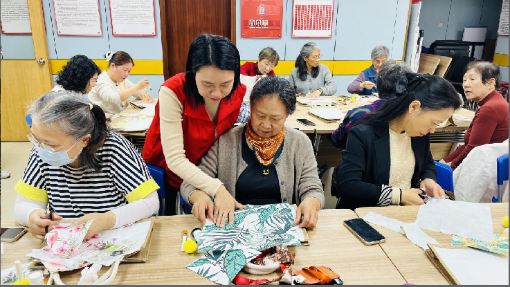 活动现场,五彩斑斓的蝶古巴特(Decoupage)专用纸张、素色帆布包、剪刀、胶水等材料整齐摆放,居民们在社工和志愿者的指导下,开启了一场蝶谷包制作之旅。蝶古巴特艺术源于法国,通过将剪裁的图案拼贴装饰于物品表面,赋予平凡物件独特的艺术生命力。居民们充分发挥创意,有的选取荷花作为核心图案,以展现元宵佳节“出淤泥而不染”的纯净意境;有的大胆尝试,用珊瑚粉、玫红色卡纸剪出火烈鸟的流线型身躯,搭配深紫色羽毛纹理,再以黑色亮片点缀眼睛,瞬间让帆布包变身“热带风情画”;更有的自由发挥,将各种花色图案进行创意混搭。有人用碎花图案纸铺满包身,再剪贴几朵立体郁金香,打造“春日花园”效果,将传统年俗与异域风情巧妙融合。