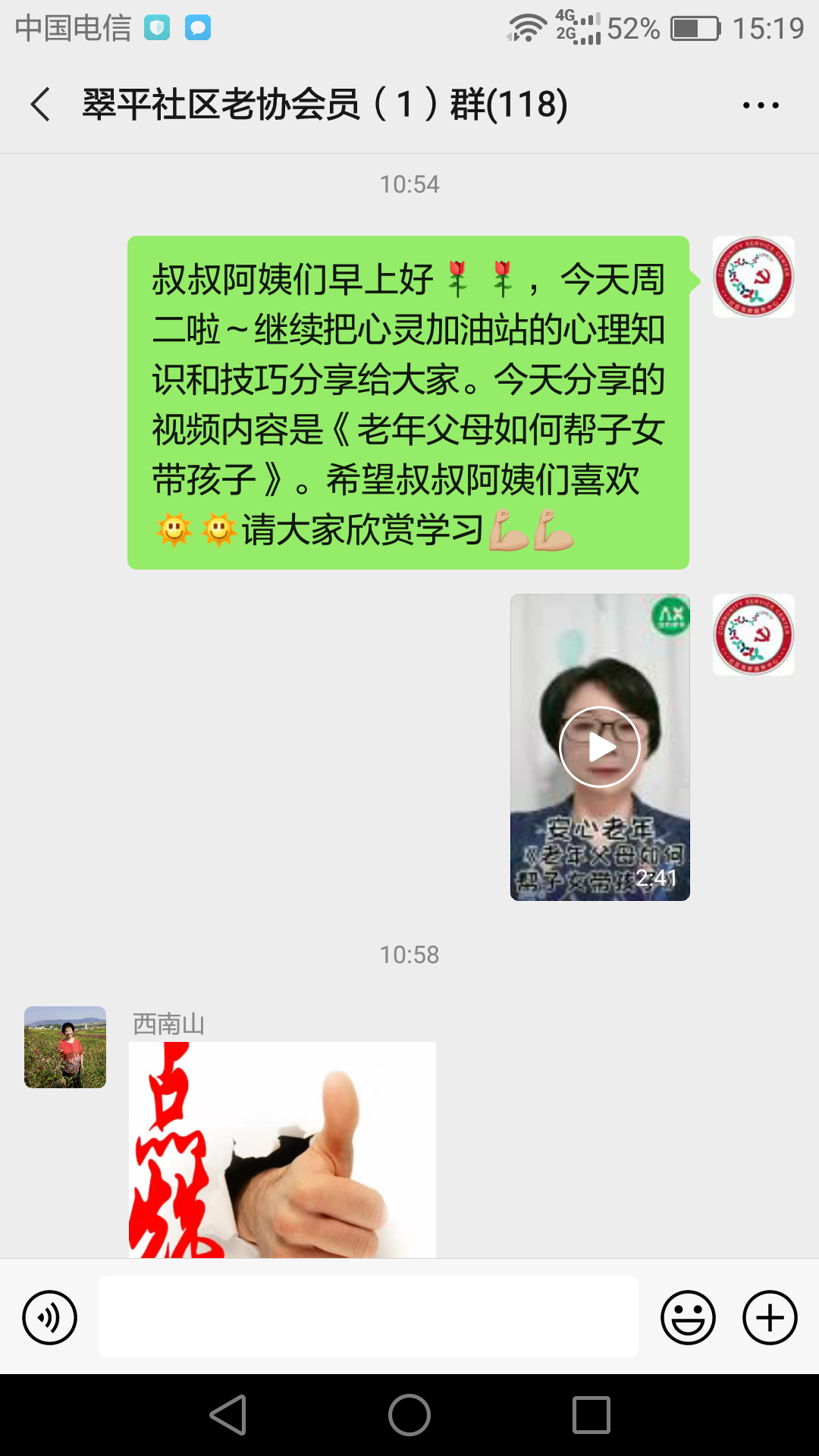 人的心理健康很重要,尤其是老年人更得拥有积极健康的心态,心理健康对老年人身体健康、家庭和谐都有很大的帮助。为促进翠平社区老年人的心理健康,在翠平社区党委的支持下,翠平社区党群服务中心社工在线上为老人们分享心理老师讲解的心理小知识。