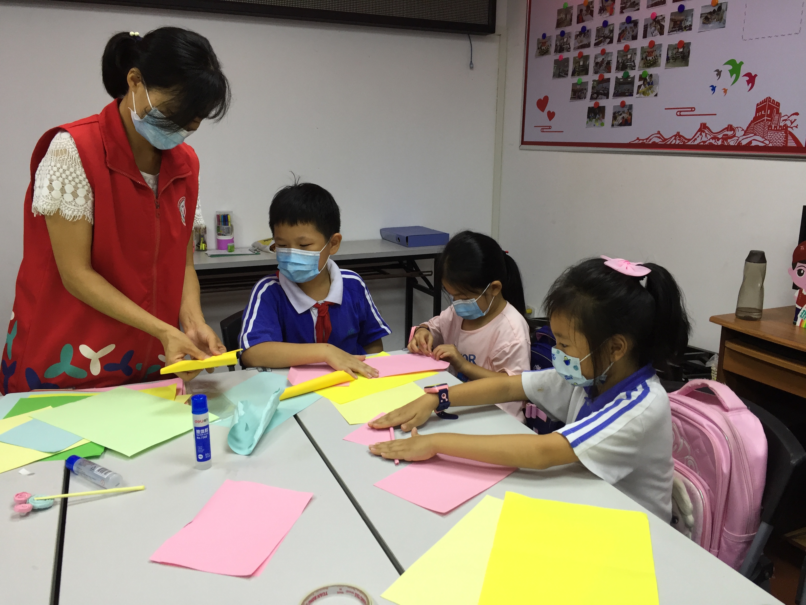 活动伊始,社工以一问一答的形式询问社区儿童家中不看的杂志会怎样处理?有的说会卖掉,有的说“会投放到可回收垃圾桶里”,社工告诉社区儿童除了这些处理方式,我们还可以利用废弃的杂志做出各种各种的物品,比如棒棒糖、花瓶。接着社工现场实操如何利用废弃的杂志做出漂亮的棒棒糖,社区儿童认真的观看,不时会发出感叹的声音,“好漂亮哦”、“我也要学会”,社工把材料发给大家并告诉注意事项,孩子们兴趣盎然,纷纷展开想象的翅膀,开始了精心创作很快一个一个“美味的棒棒糖”做好。