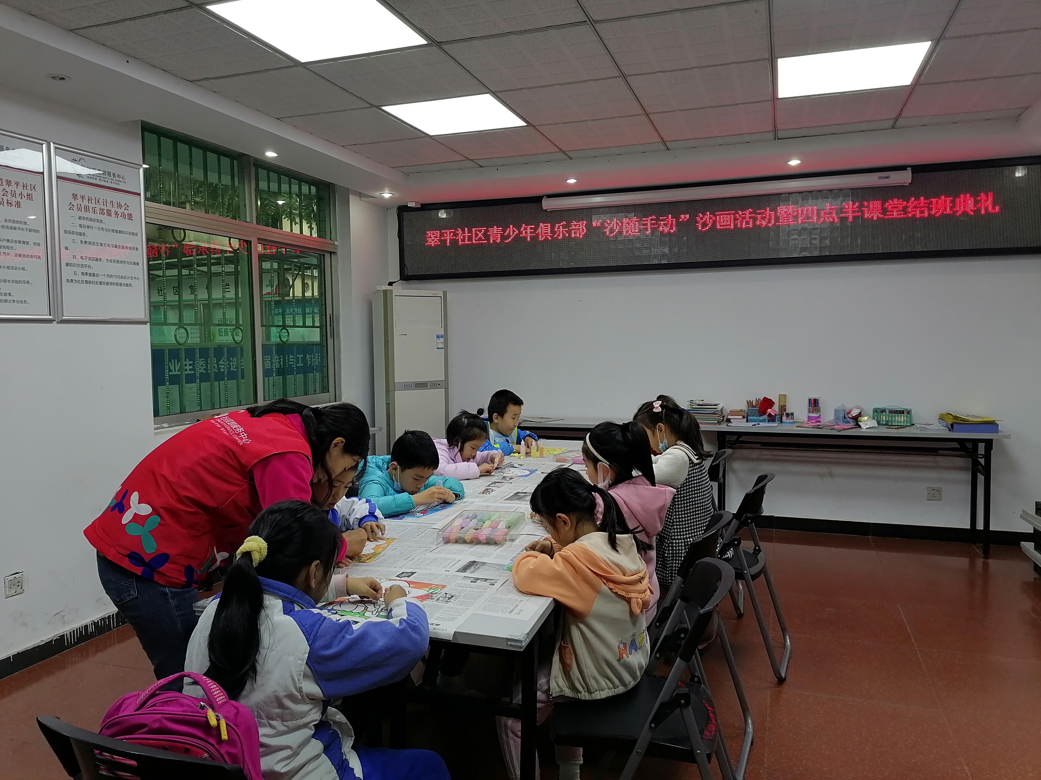 为了缓解社区儿童青少年期末考试的压力,丰富假期生活,培养孩子的创造力和交往能力。在翠平社区党委的支持下,翠平社区党群服务中心社工于2021年1月15日下午开展“沙随手动”沙画暨四点半课堂结班典礼活动,共吸引10位社区儿童参与。