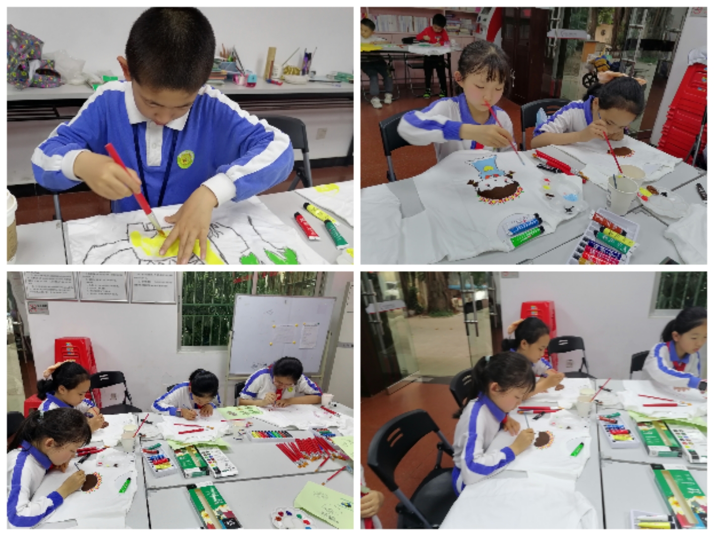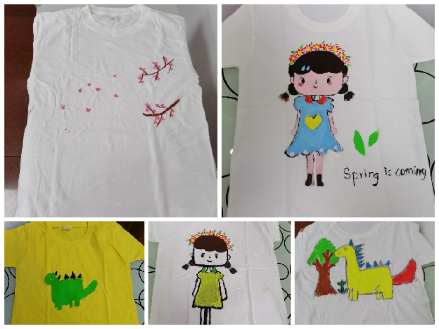 活动伊始,社工引导儿童青少年介绍春天里看到的景色,及代表春天到了的景物。接着,社工示范在T恤上绘画时需要注意事项并把材料发给孩子们,孩子们拿到材料以后,一只只画笔在孩子们手中挥舞,首先用画笔把自己独特创意的图画画出来,接着五彩缤纷的颜料被涂画在纯白T恤上,在DIY中孩子们享受着制作的乐趣。每个人认真专注、创意新颖,很快一幅幅描绘着自己的内心世界的作品创作出来。