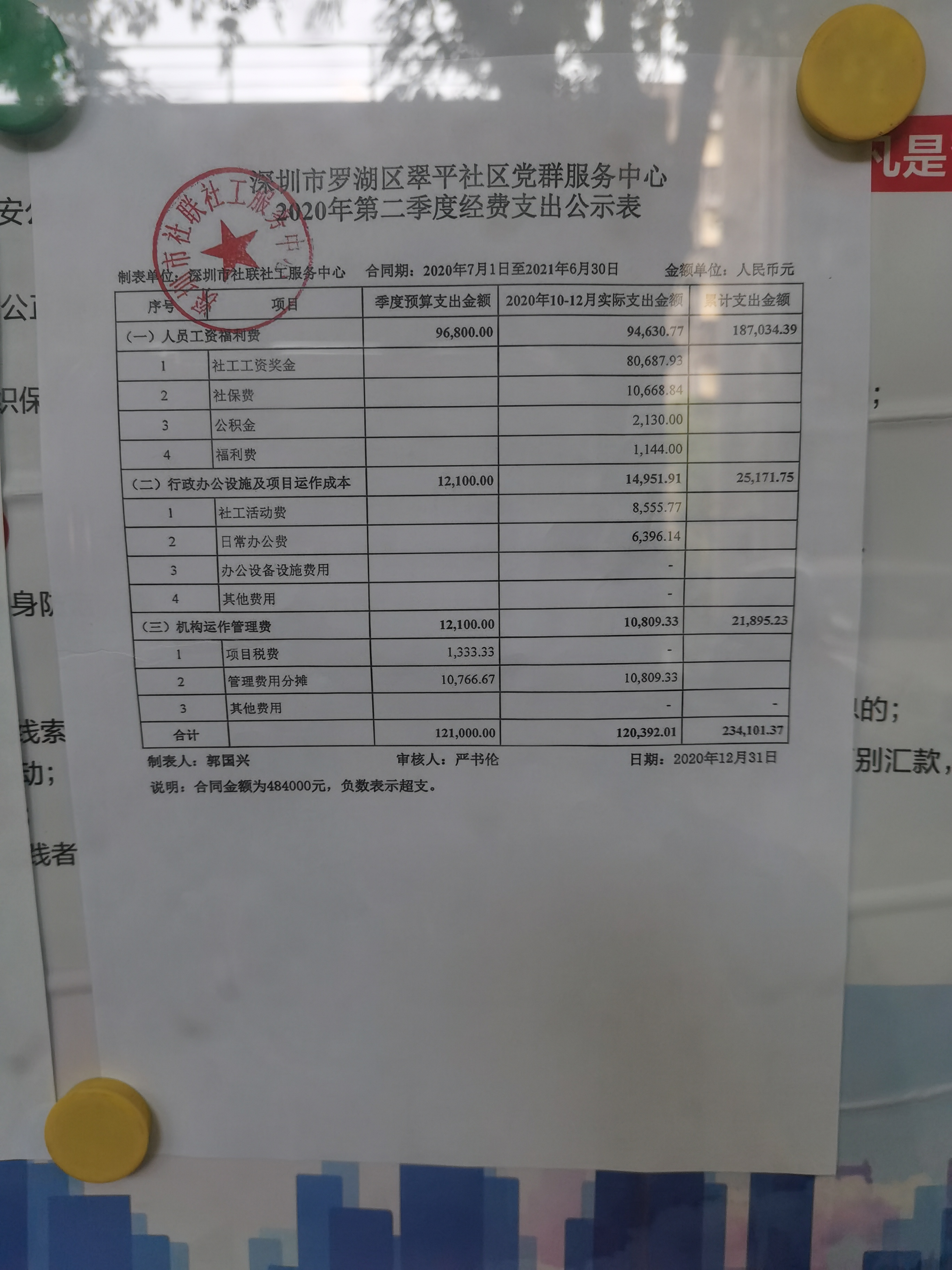 深圳市罗湖区翠平社区党群服务中心2020年第二季度经费支出公示表