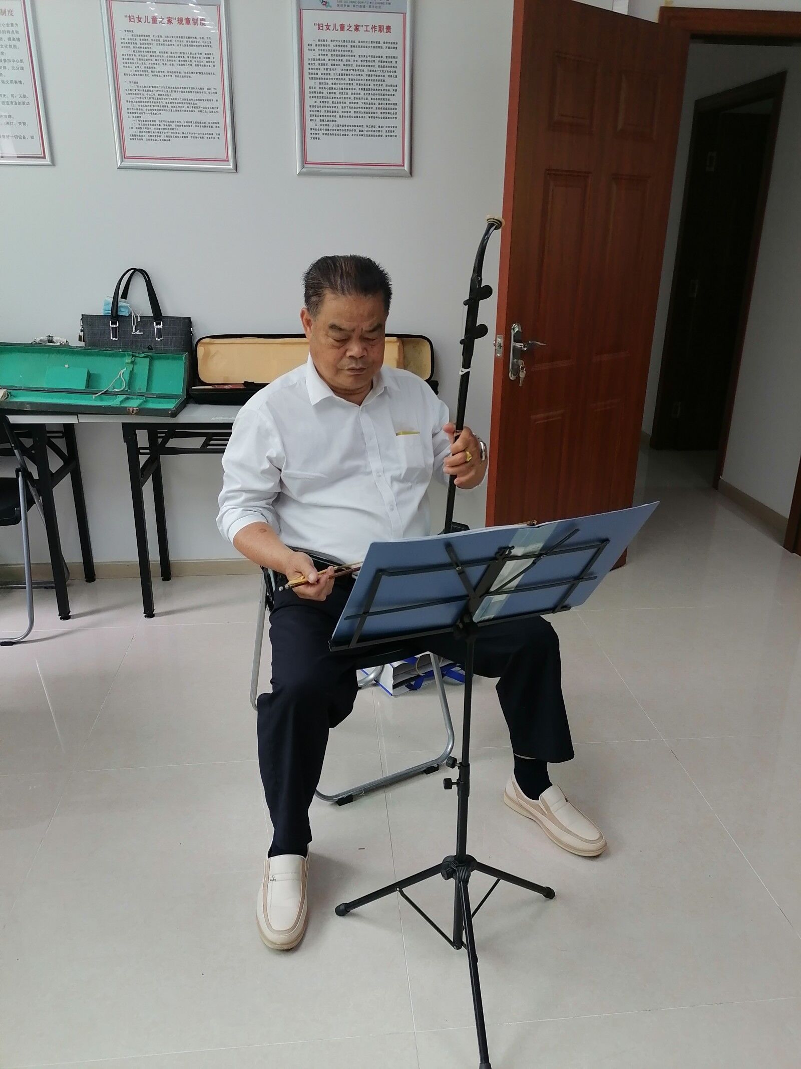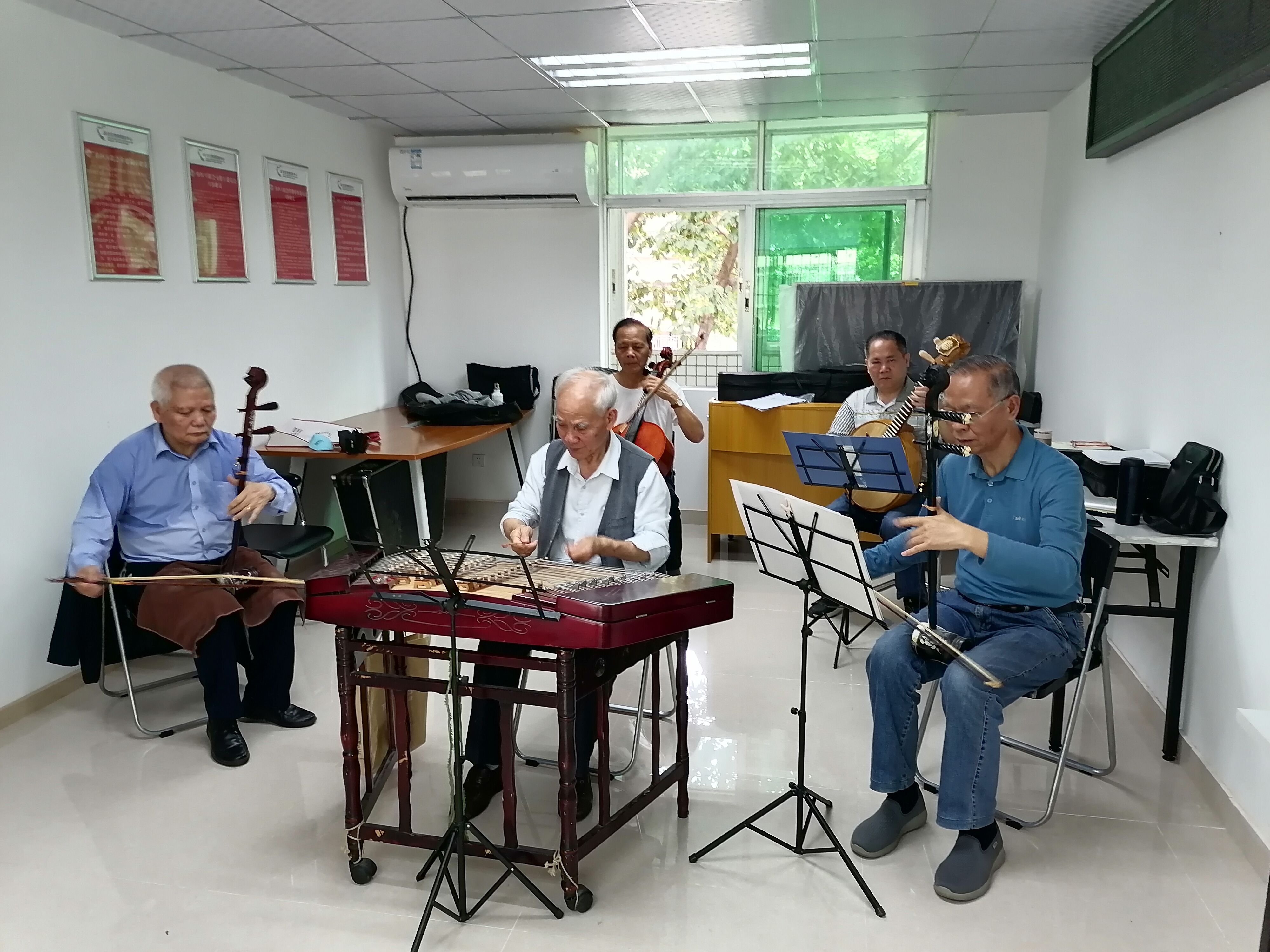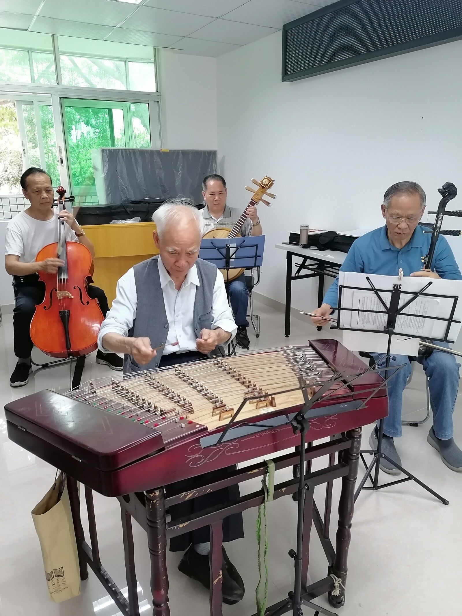 签到、测体温、调试乐器一气呵成,社区长者们很有节奏感地放开演奏,有的叔叔不仅会弹奏扬琴,而且还会演奏二胡等。艺苑古乐队的成员们在一起演奏慢慢形成一定的默契,互相夸赞对方的琴艺好。