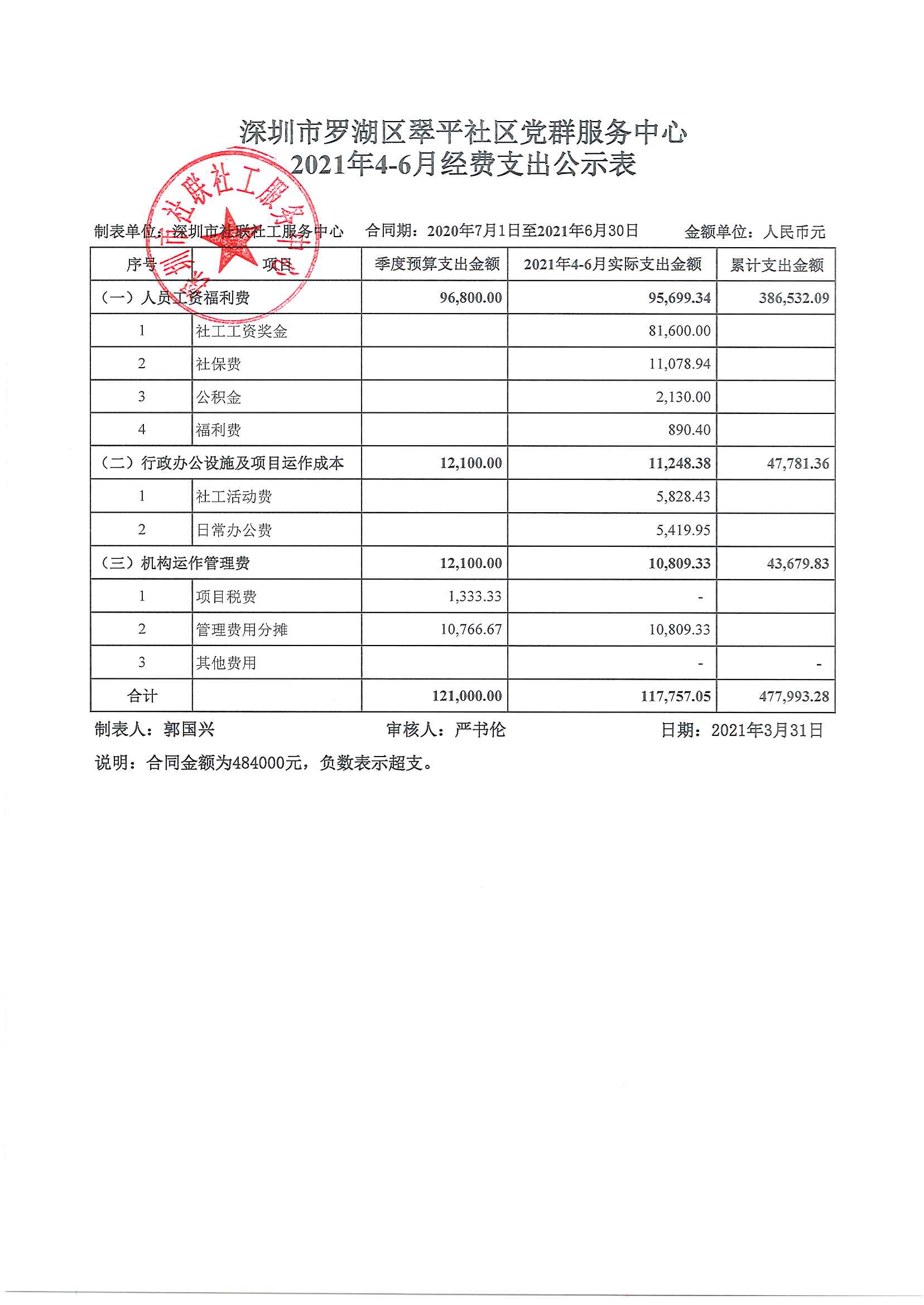 深圳市罗湖区翠平社区党群服务中心2021年4-6月经费支出公示表