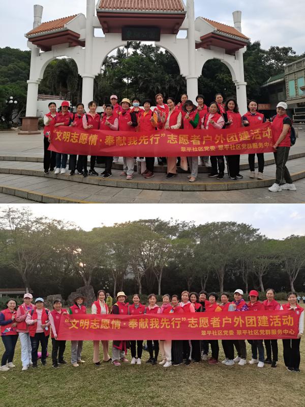 来了就是深圳人,来了就做志愿者,这句标语时常在深圳的大街小巷看到。随着时间的推移,翠平社区志愿者队伍也逐渐壮大,他们是翠平社区的“守护者”,居民骨干,参与社区治理的先行者。2021年12月17日在翠平社区党委的支持下,深圳市社联驻翠平社区党群服务中心社工开展“文明志愿情,奉献我先行”志愿者户外团建活动,活动共吸引了25名志愿者参加。