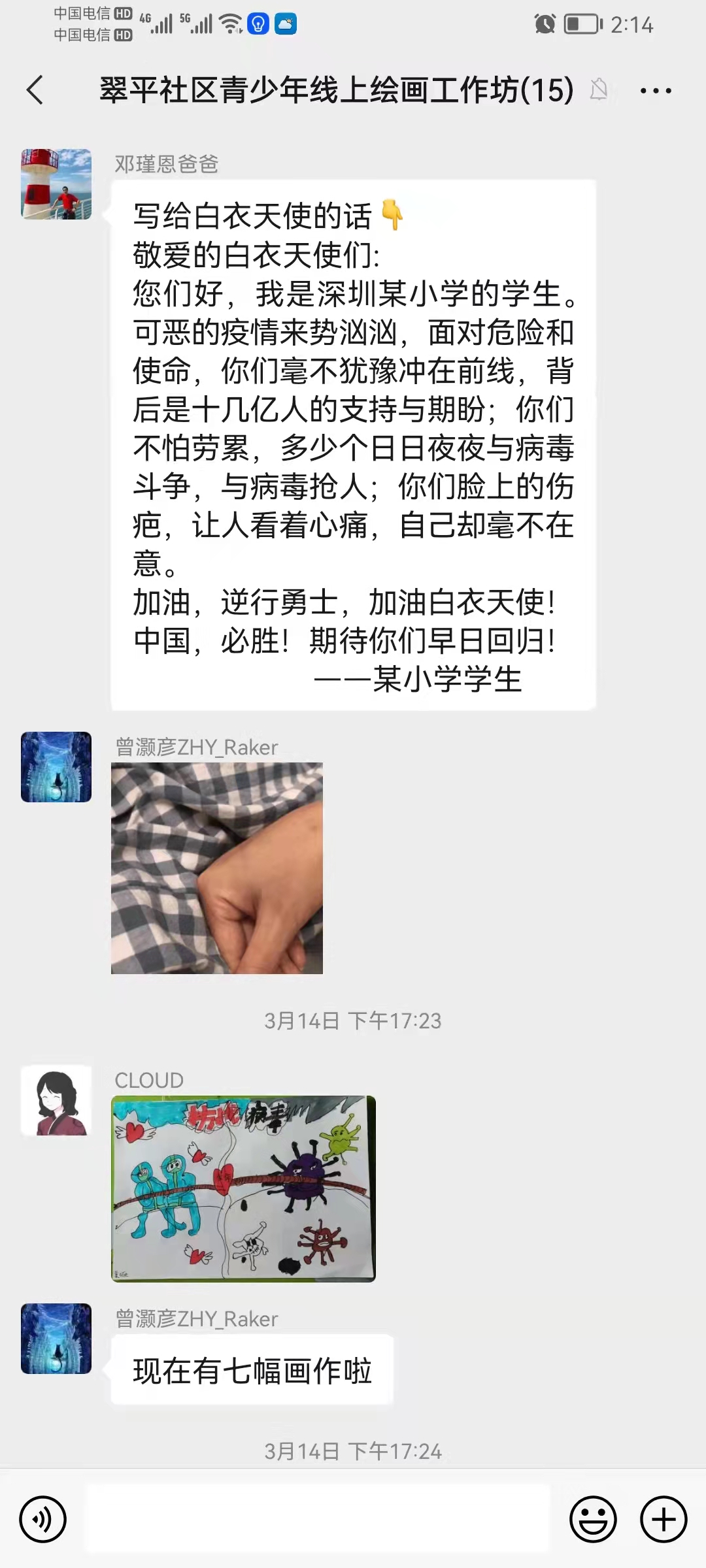 在深港两地疫情肆虐的当下,居住在社区的孩子们除了有着继续完成学业的需求外,也有着为疫情付出自己贡献的情感需求。为了提供平台让孩子们表达他们的心意,为在一线防控疫情的工作人员送上祝福,在翠平社区党委的支持下,翠平社区党群服务中心社工于3月13日开展了“尽情挥毫,释放光彩”线上绘画工作坊,让社区青少年儿童通过自己的画笔和创意,为深港抗疫摇旗助威。