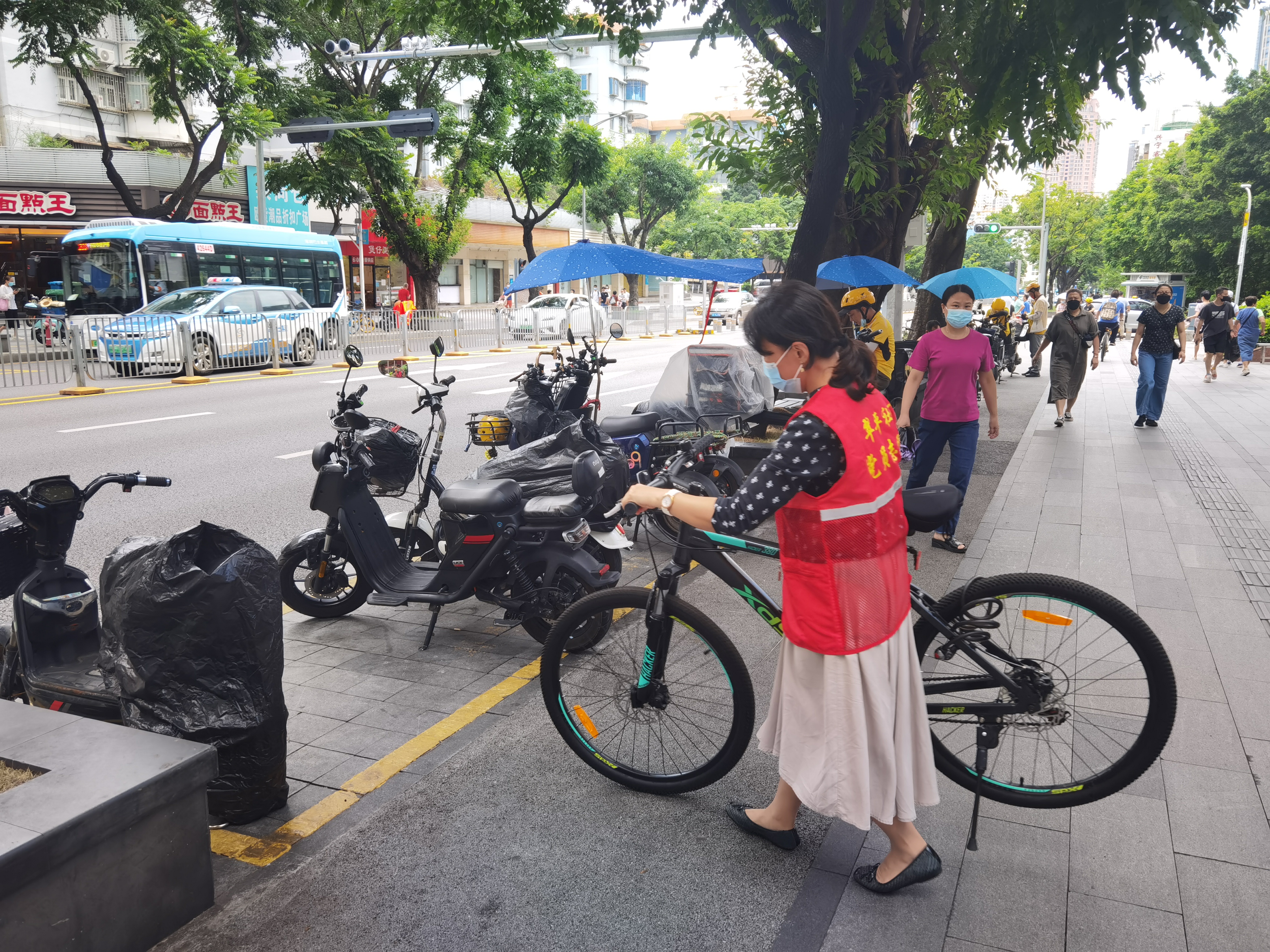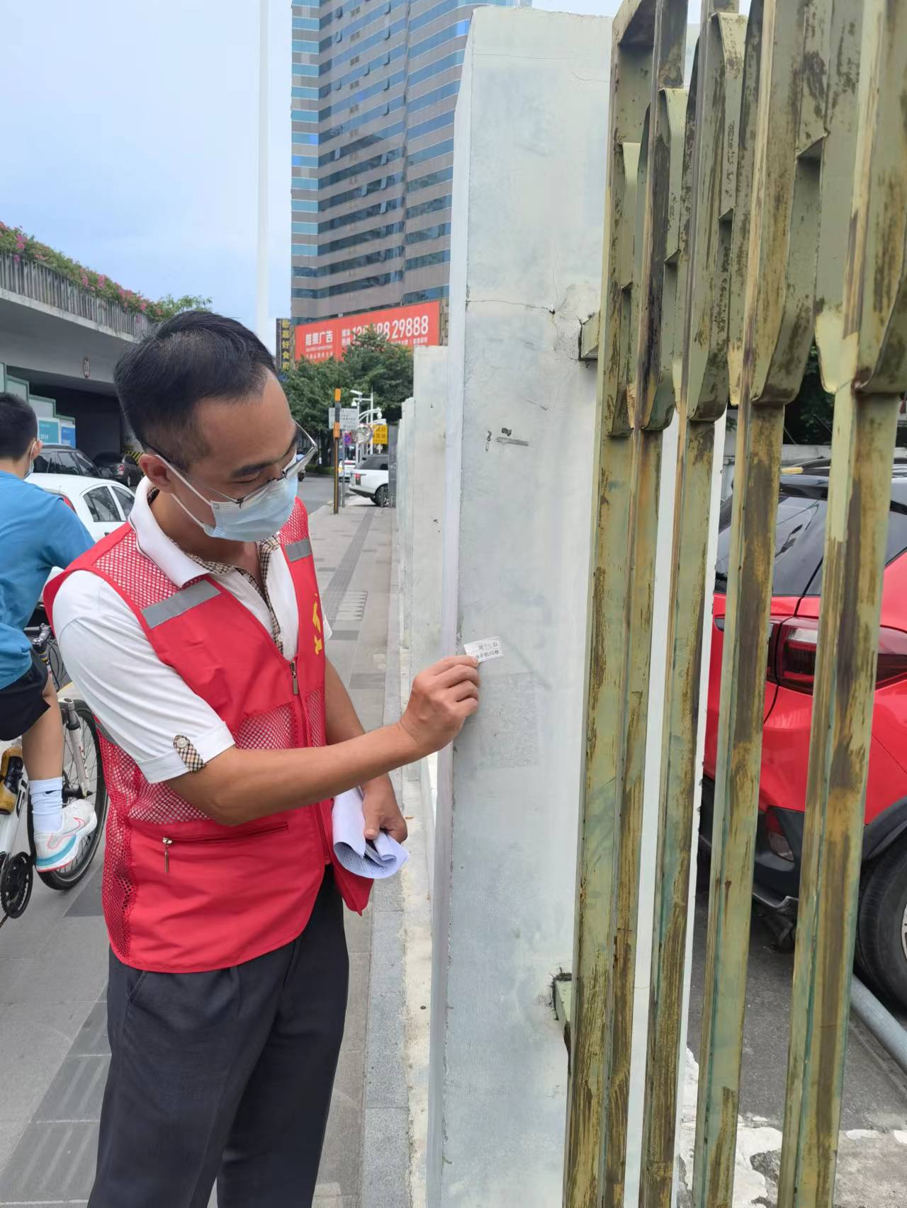 区机关党员志愿者以实际行动承担共建职责,对照道路测评标准到翠竹路、文锦北路、田贝三路等主次干道开展创文整治工作,对车辆乱停放、公益广告破损、小广告乱粘贴、乱丢垃圾、不遵守交规等不文明行为进行劝导和整改。