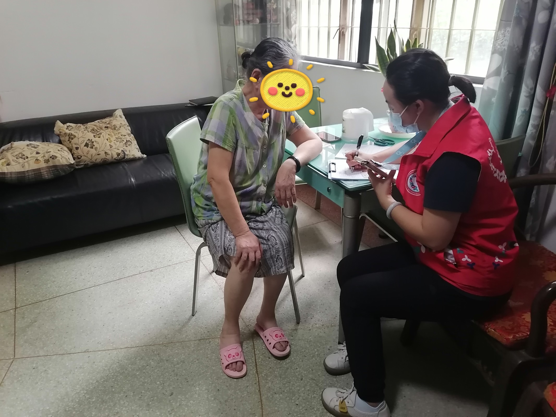 本次探访中,社工与他们亲切交谈,了解他们的身体健康、家庭成员状况,倾听他们的所需所想并做好记录,以便后续更好地跟进。走访中,我们来到了七十八岁的黎阿姨家中,她患有多种老年人基础疾病,需要长期服药,平日里除了上街买菜、做核酸,还要在家中照顾中风多年的老伴,很少与外界交流。社工充分发挥专业优势,为服务对象提供个性化的服务。