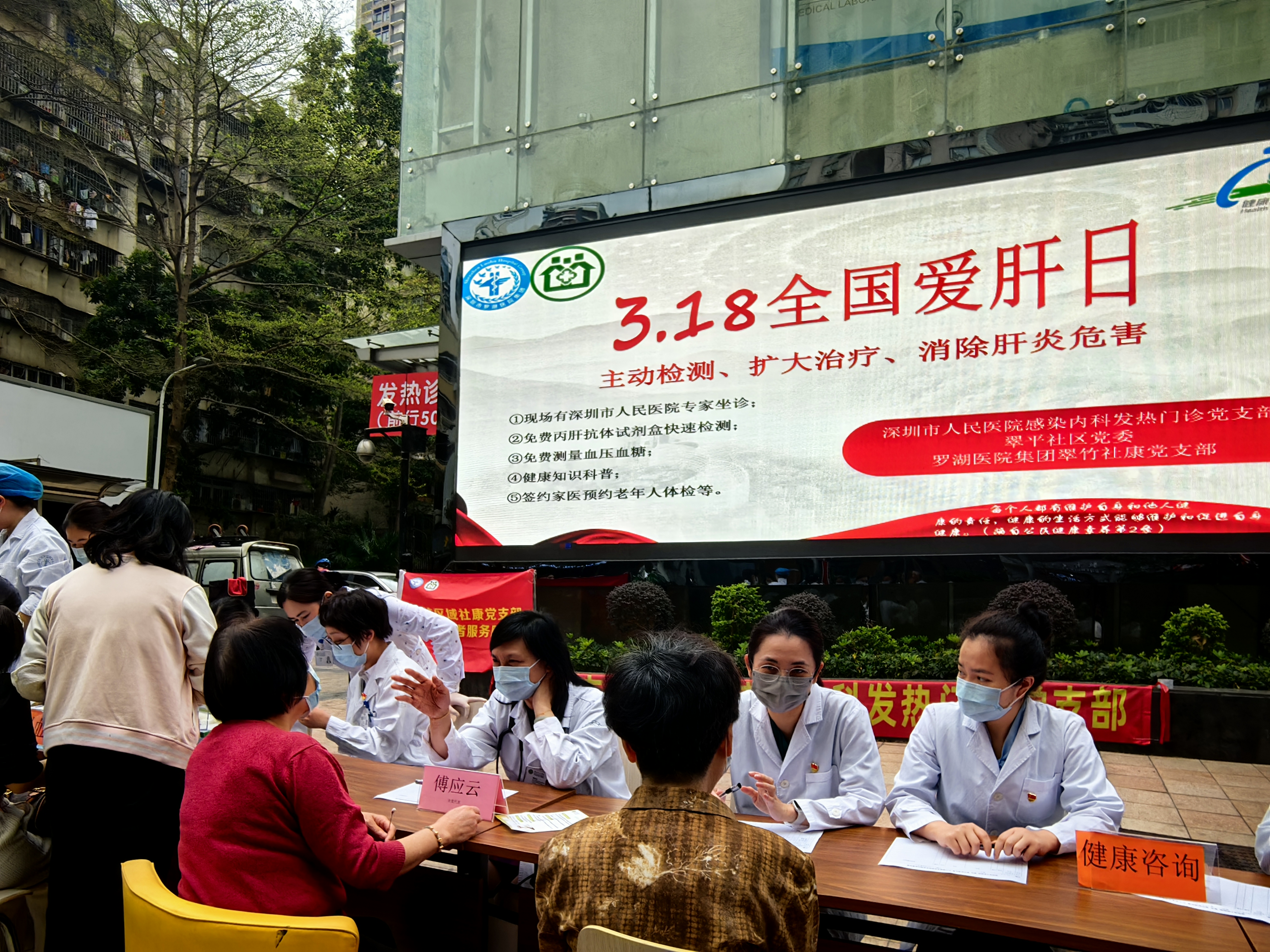 2023年3月18日是我国第23届全国肝日,为向辖区居民宣传肝病知识,促进居民由“被动检测”转化为“主动检测、治疗”,市党代表进社区开展义诊活动。义诊活动前,工作人员通过线下招募、居民群聊分享等方式提高活动知晓率。活动当天,深圳市党代表傅应云、市人民医院感染内科发热门诊专家、翠竹街道社康服务中心医生现场提供健康科普、免费丙肝抗体试剂盒快速检测、免费测量血压血糖等服务。市党代表进社区义诊活动是市党代表发挥个人职业优势履职尽责、为民服务的有效途径,做到了将医疗资源带到居民家门口,真正实现了“便民”、“利民”。