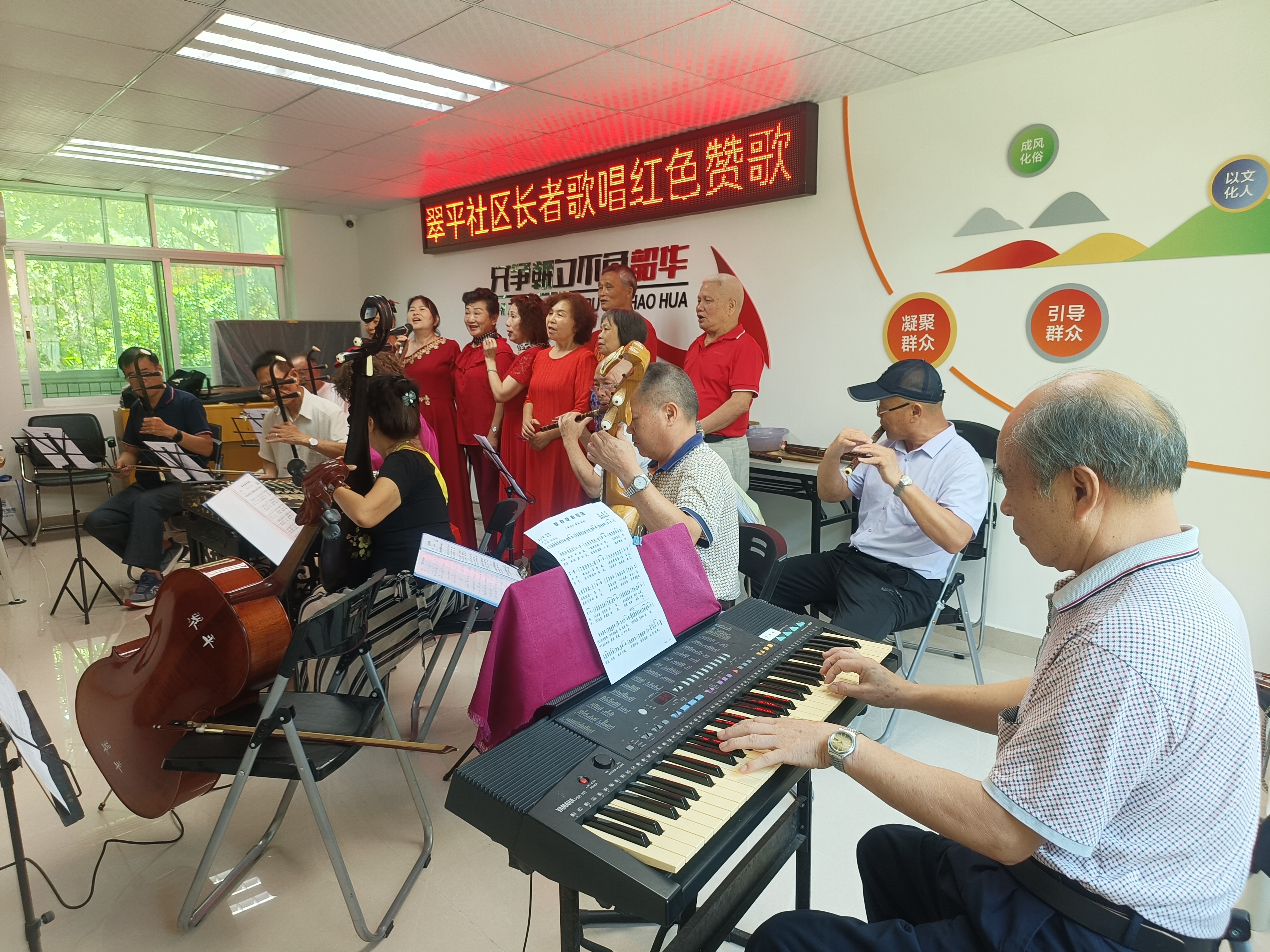 2023年7月6日上午,在翠平社区党委的支持下,翠平社区工作人员组织社区老年音乐爱好者在中心三楼活动室举办歌唱红歌活动。活动歌曲包括《我和我的祖国》、《中国人民志愿军战歌》、《十送红军》等经典红色曲目。此次将党史学习教育与老年人日常文娱活动相结合,引导社区长者歌唱红歌,礼赞党和国家,激发社区居民爱党爱国情怀。