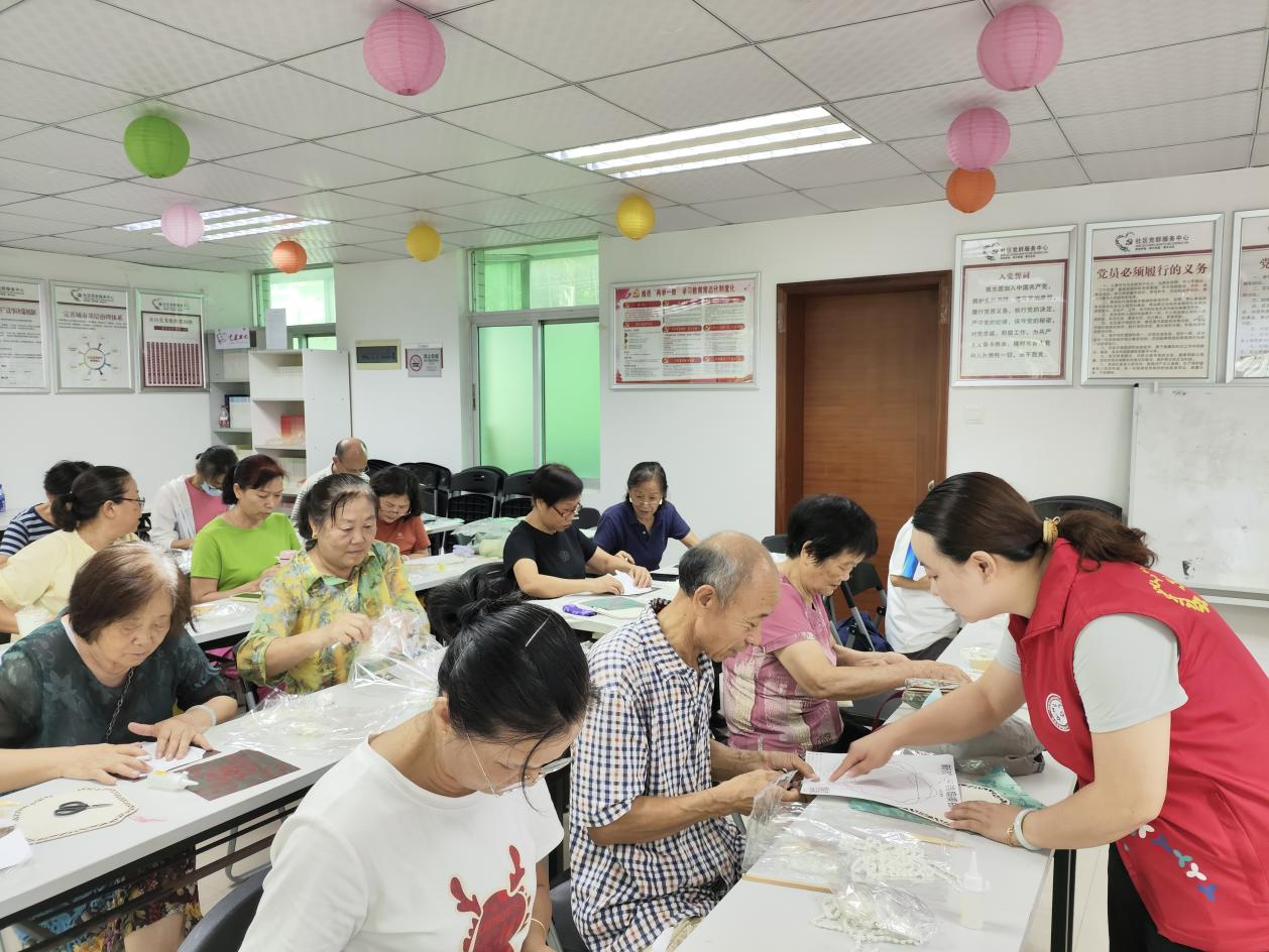 讲座后,活动第二部分展开,由社工带领大家进行手工 DIY 国风宋锦珍珠扇制作。剪模板、嵌珠、固定…… 老人们专注于指尖创作,欢声笑语中,一把把雅致扇子渐显雏形。居民李阿姨说:“既能学情绪调节,又能做手工,这样的活动比在家闷着好多了!”
