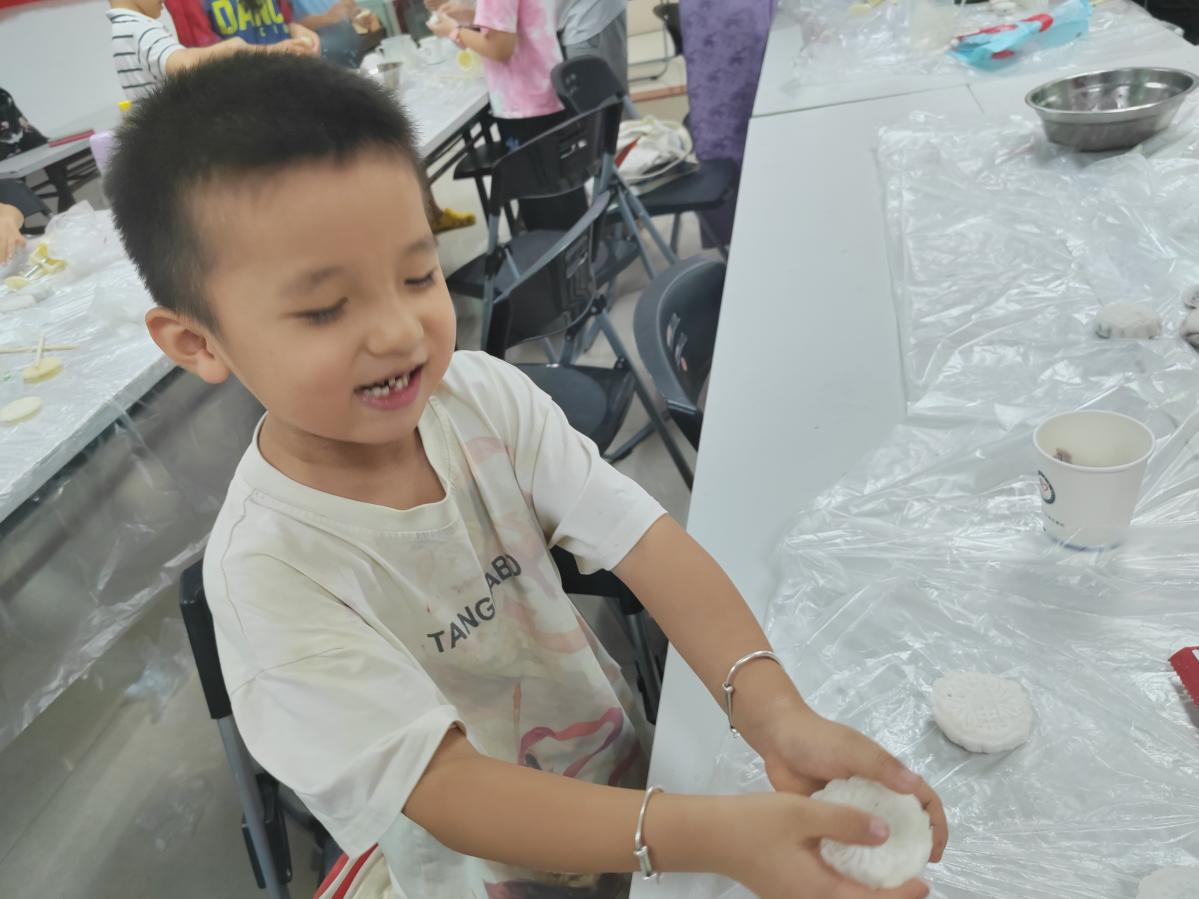 从和面、包馅到压模成型,孩子们在家长的陪伴和协助下,一步一步地完成了月饼的制作。他们的小手虽然不够灵巧,但在家长的耐心帮助下,还是成功地做出了一个个形状各异的冰皮月饼。这些月饼看上去大小不一,各具特色。孩子们看着自己亲手制作的月饼,脸上洋溢着自豪与满足的笑容,家长们也纷纷拿出手机,记录下这团圆时刻。