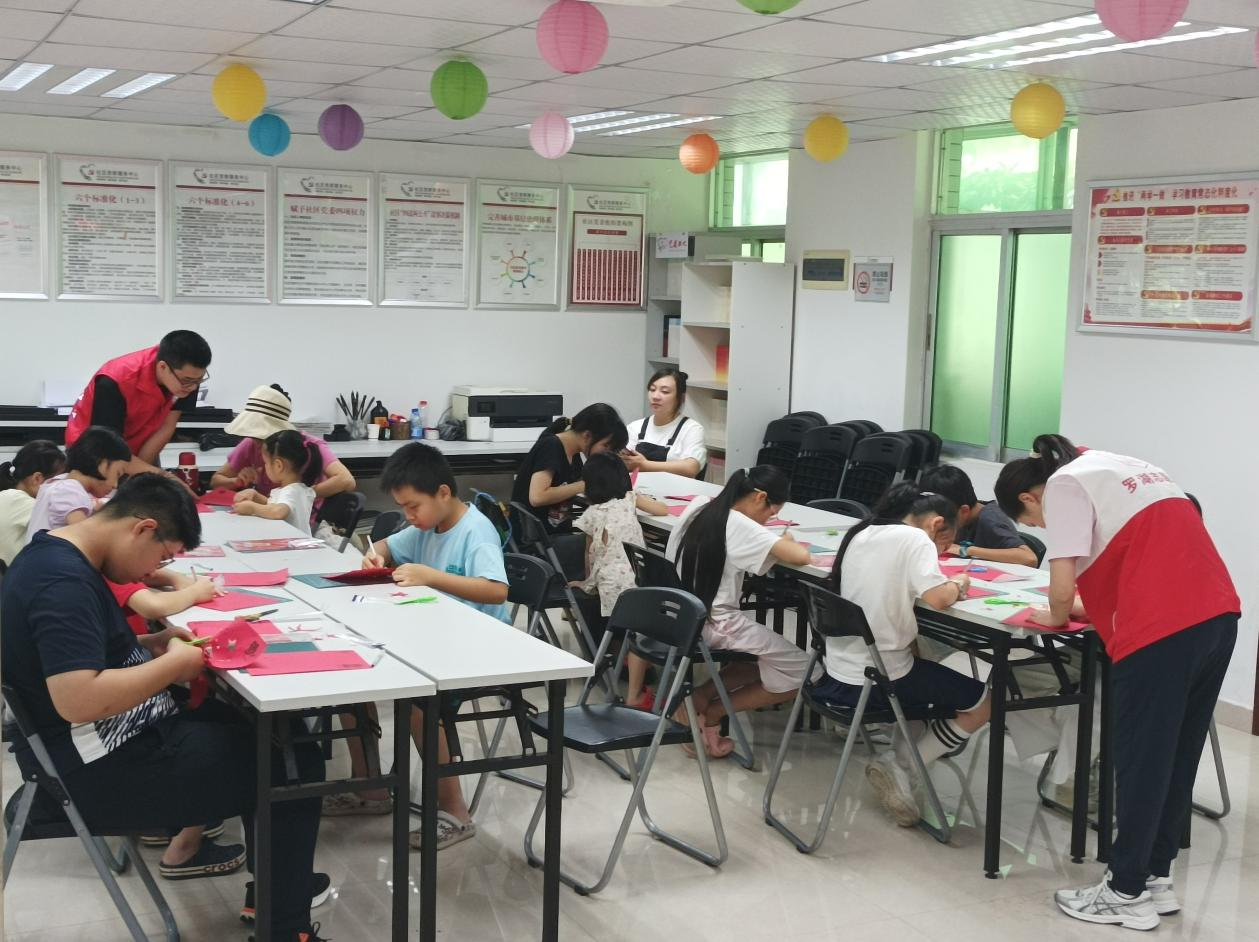 本次活动开始后,社工首先从国庆节这一重要节日的变迁入手,向孩子们讲述了国庆节的历史意义和深厚内涵,让他们了解国家从成立到发展壮大的光辉历程。随后,社工详细介绍了剪纸艺术这一中华传统文化的瑰宝,并且通过提前做好的剪纸范例引起了大家的好奇心。在社工和青少年志愿者的指导下,孩子们纷纷拿起剪刀、刻刀和绘有爱国主题图样的红纸,小心翼翼地在刻板上创作属于自己的国庆主题剪纸作品,现场气氛热烈而温馨。