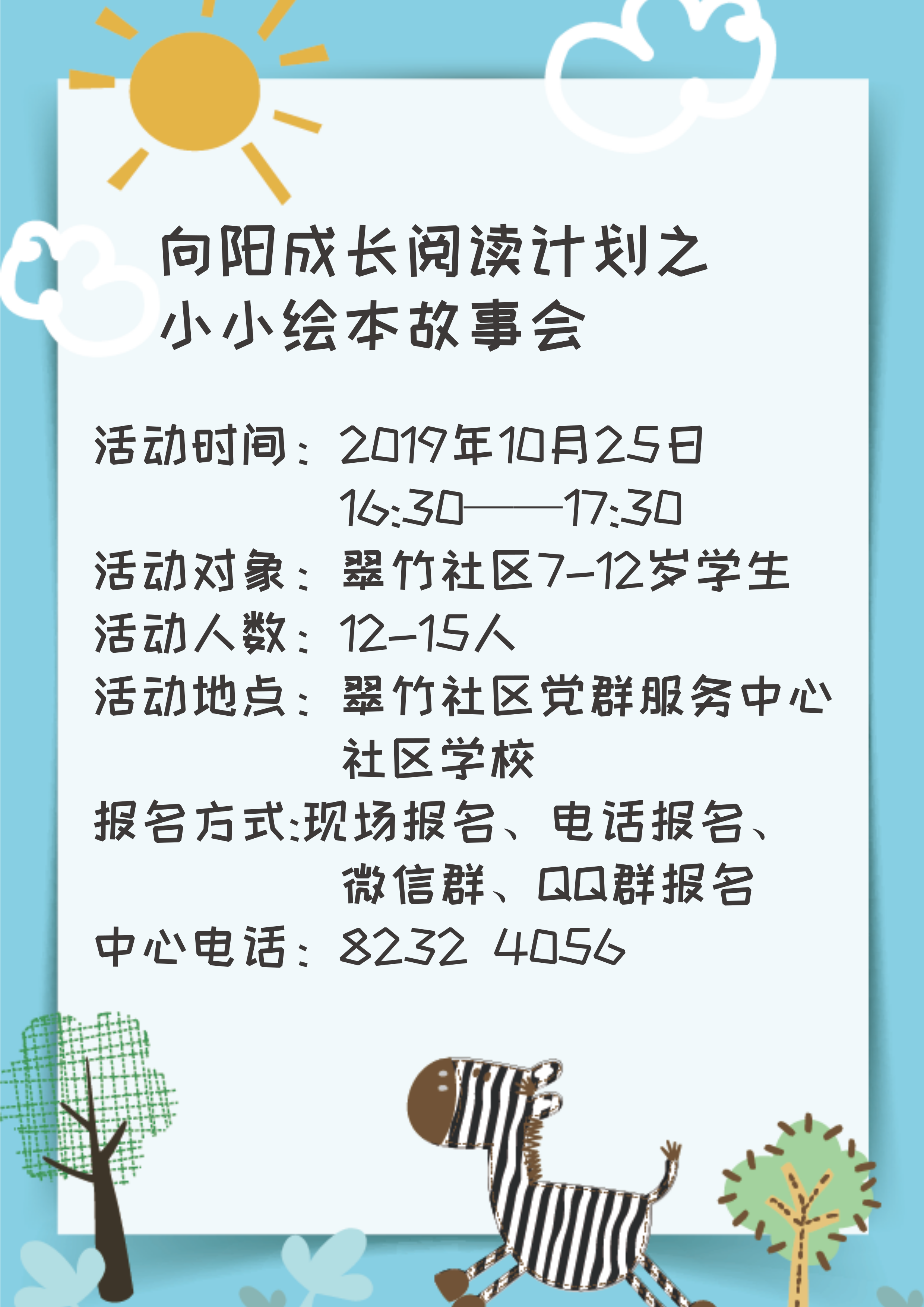 为丰富辖区学生的课余活动,提高阅读能力,我社区将于10月25日开展向阳成长阅读计划之小小绘本故事会活动,具体情况如下: