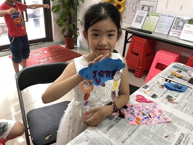 在最后一节课程的时间里,大家都很珍惜每一分每一秒。在社工的引导下,充分利用前半节课完善自己的最后一个作品:贝壳风铃,面对最有难度的一个作品,小朋友们依然用心制作,凭自己的创意做出了最终的成品。在课程的展示与分享环节中,很多小组成员都能够拿出三种作品,其中有一个小朋友在分享时说道:“每个作品要有自己的创意,不要看别人的。在粘胶水的时候,不要这里粘一点,那里粘一点,一定要细心、认真。”收获了大家的掌声。