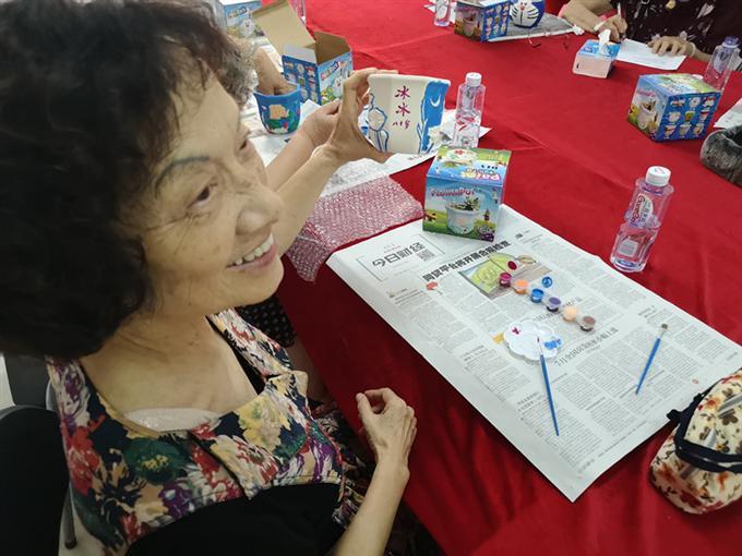 活动开始,在社工的带领下,各位老人齐动手做起了手指操运动,动作简单,做完还一身顺畅。接下来是活动气氛的小游戏“逆口令”,当社工说出一个动作时,长者们作出相反的动作,大家举左手、举右手,玩得非常开心。最后组织大家一起彩绘陶罐,用画笔颜料把一个个单调的陶罐画得生动多彩,老人们还非常有想法把自己的名字都写上去了,其中一个阿姨还说道:“参加这个活动感觉自己都回到童年时光了”,大家一边涂画一边聊起了童年记忆。