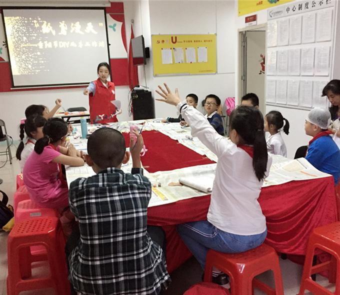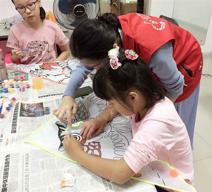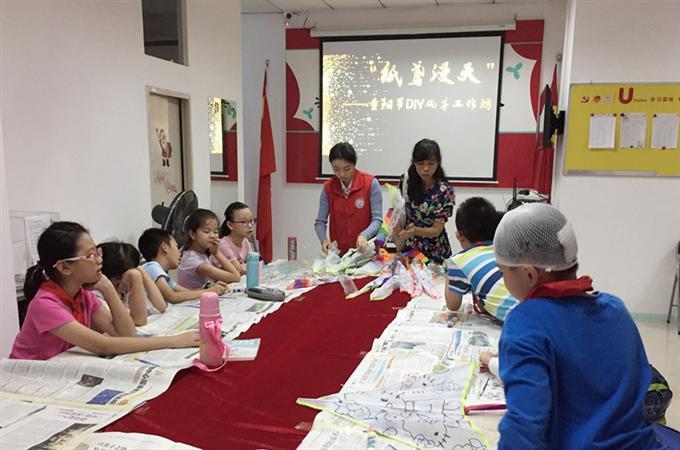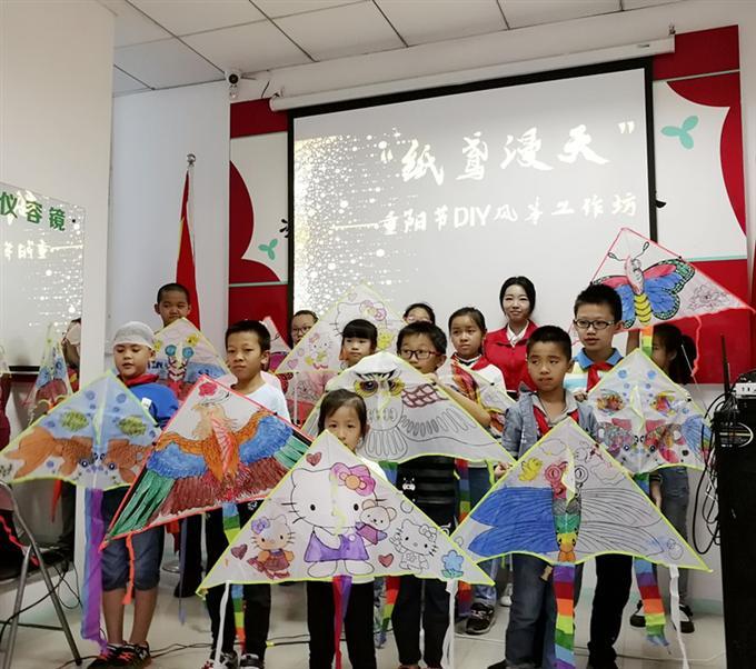 活动开始由社区党群服务中心的社工讲解了重阳节的由来及风俗习惯同时介绍了风筝的演变过程和手工步骤。随后同学们还一起背诵了关于重阳节的古诗词。在绘画风筝的过程中,同学们通过“拍卖”竞选的形式争取喜爱的风筝图案,积极地分享自己对于所选图案的理解及意境用画笔描绘出来,现场气氛热烈,还不时有下班后赶来的家长与孩子共同完成作品。