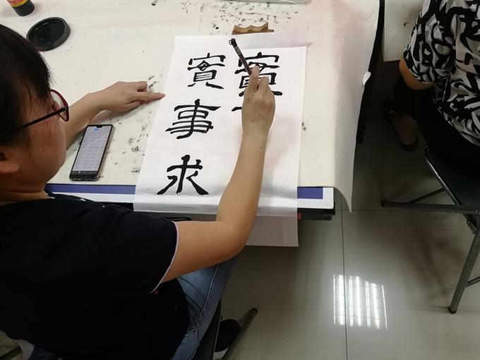 书法兴趣小组五节课程分别由敦修书院赵院长和社区热心的书法爱好者,担任书法老师,带领大家从一横一竖到横折、撇、捺书法入门开始学习。每一节都安排学习任务,第一节任务作品是“三横一竖的王”,第二节作品是“一日千里”、第三节作品是“不忘初心”、第四节作品是“实事求是”,第五节重新温习一遍老师传授的知识。从每一节小组的作品中,能看出大家在这一个月进步非常快。学习书法贵在坚持练习,是没有捷径可走的,要从一笔一划练习写出来的,老师的作用是带领大家入门,掌握基础的知识,遇到瓶颈给予及时的指导。