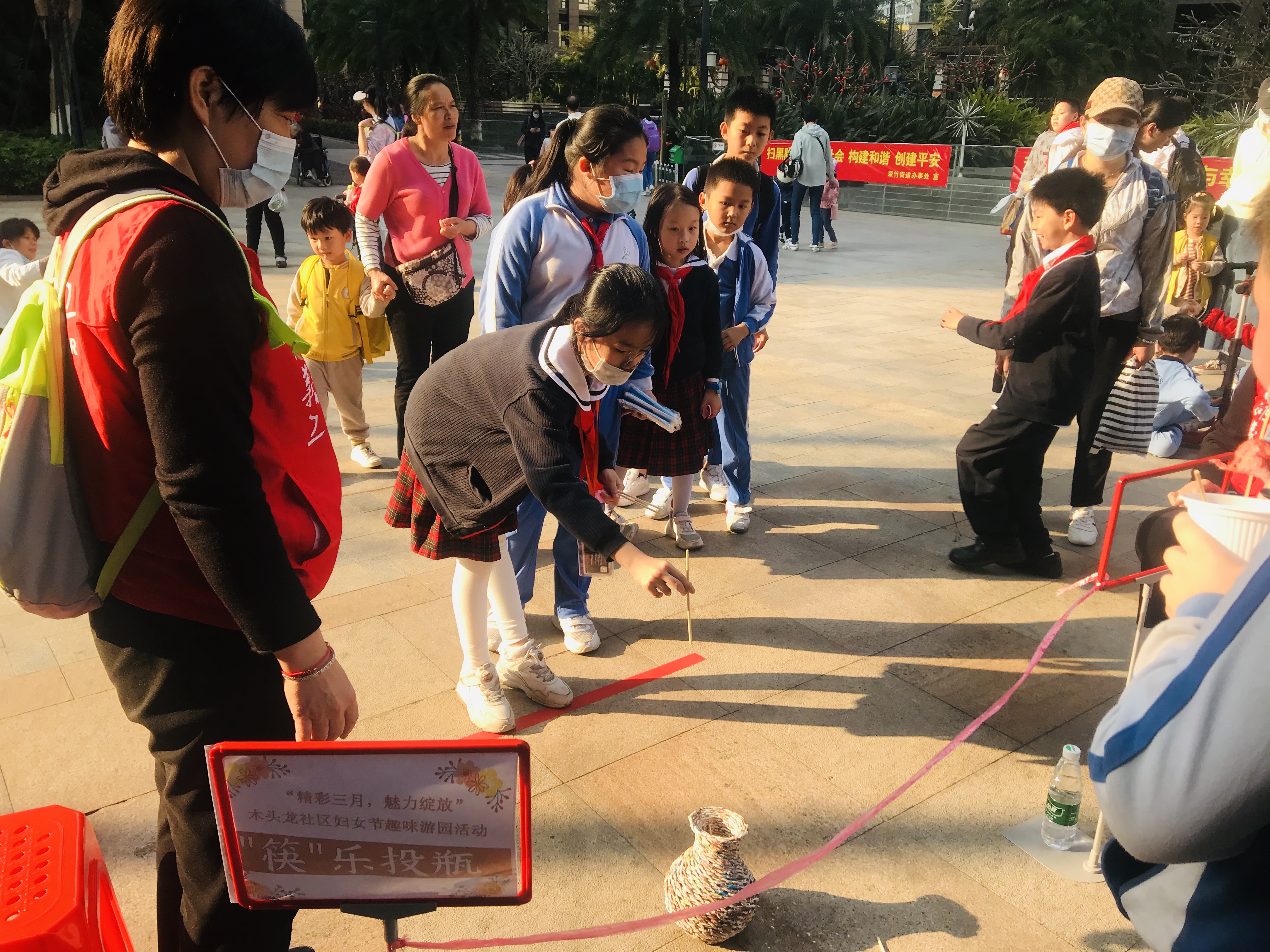 罗湖家园讯:为庆祝国际三八妇女节,展示社区巾帼美丽风采,木头龙社区于3月8日下午在合正荣悦府南门小广场开展了精彩三月,魅力绽放”妇女节趣味游园活动,吸引了社区100多位居民参与。