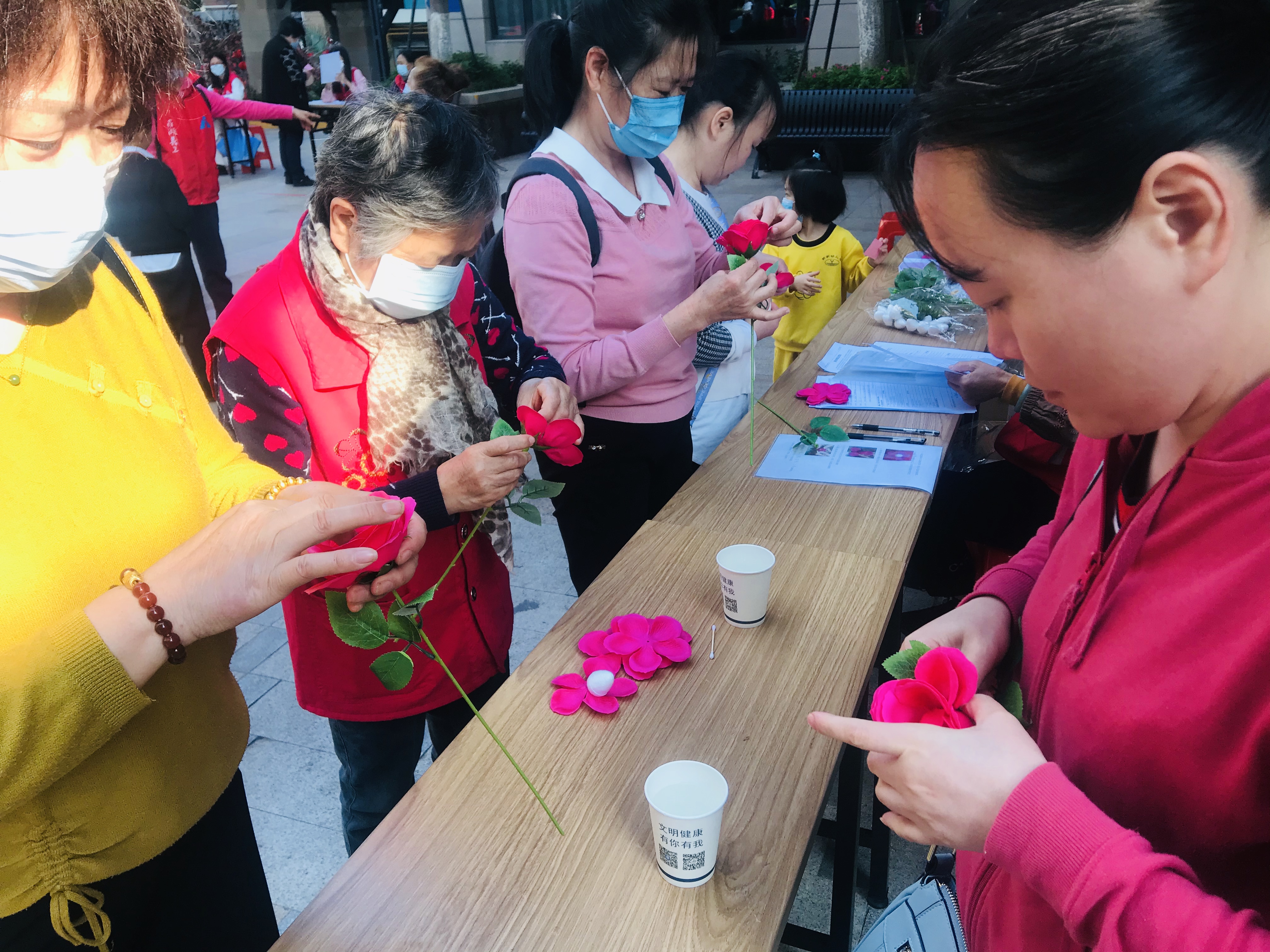 下午四点,9位巾帼志愿者与工作人员一起有序站到自己负责的游戏摊位,引导社区居民到场领取入场券,凭入场券参与游园活动。本次活动的内容形式多样,有趣味知识竞答、筷子投瓶、两人协作运球等趣味游戏。现场的妇女、小朋友们都从各方面展示自己的活力风采,活动气氛热烈。在玫瑰皂花制作摊位,女性同胞们耐心细致的呵护着手中的花瓣,在花堆中感受diy的乐趣。另一边还有社区驻点律师为居民讲解反家暴知识,让女性居民提高自身反家庭暴力的意识,懂得维护自身合法利益。