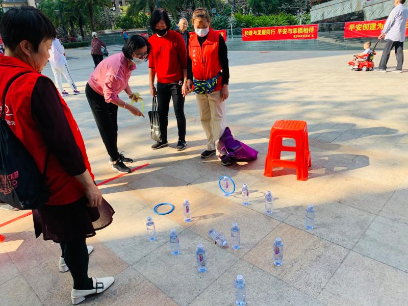 活动现场设有签到处、社工服务宣传展示、欢乐套圈圈和海底捞月2个摊位游戏、奖品兑换摊位。活动中,社工通过发放宣传单、摆放易拉宝展架和服务照片板向社区居民宣传社工服务活动和服务成效,让居民了解社工和义工的区别,并通过知识问答的方式加深居民对社工服务的认识。
