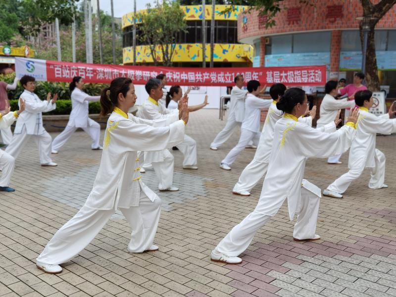 社区太极拳队用科学的锻炼方法和健康意识,提升健康素养,以昂扬的气势展现太极魅力,祝福党的生日。通过活动,传播正能量。技能训练的目的是,增强和提高太极拳爱好者的健身意识和身体素质。同时,在继承优质传统文化的基础上,培养对非物质文化遗产的传承和保护。