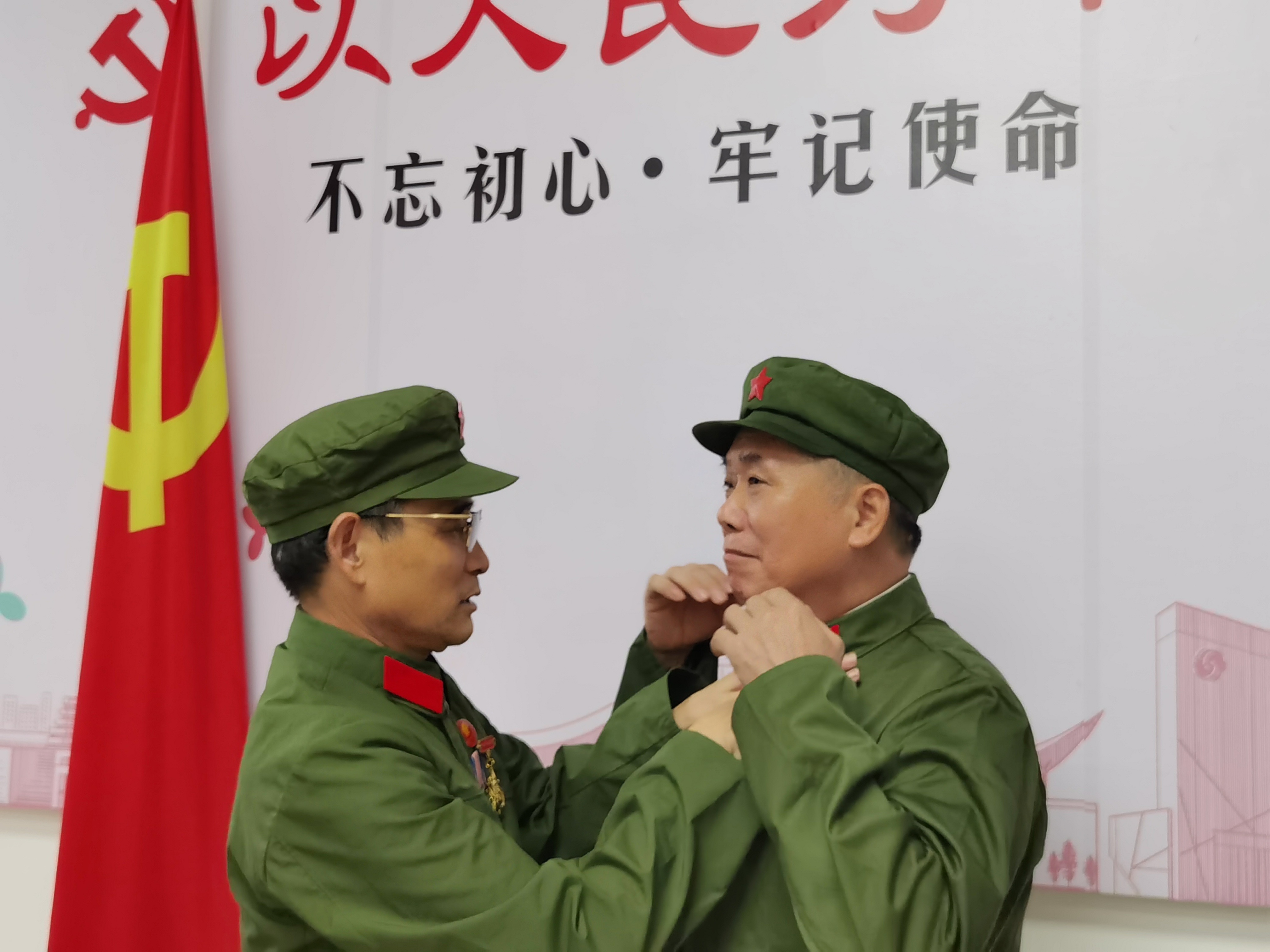 “忆峥嵘岁月,敬退伍老兵”。为弥补老人心中的遗憾,再现往日军人风采,参与活动的退役军人在现场工作人员的协助下一起身着65式军装,戴上熟悉的军帽,认真、严肃地佩戴属于自己的勋章,在国旗、党旗下留下自己的照片,缅怀自己的从军生活。在拍摄间隙,退役军人还讲述他们当年在部队的生活,重温军旅荣光,并留下珍贵的纪念。