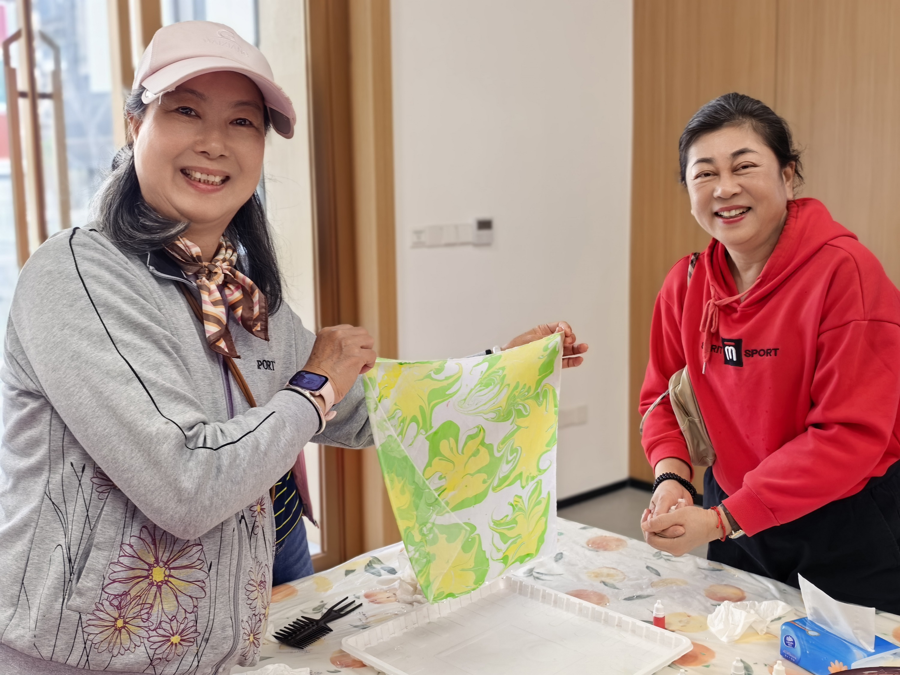 活动现场,工作人员围绕社区妇女的实际理财需求,开展了一场内容充实、实用性强的理财科普讲座。讲师用通俗易懂的方式讲解家庭理财、风险防范等知识,帮助大家树立理性、健康的理财观念,切实提升自主理财能力。理财知识分享结束后,非遗水拓丝巾手工环节温情开启。社区工作人员提前备好颜料、丝巾、工具等材料,专业老师现场示范水拓画创作技巧。大家沉浸在手工创作的乐趣中,轻滴颜料、缓缓拓印,在水中勾勒出独一无二的纹理图案。活动现场,姐妹们相互交流心得、互帮互助,分享创作灵感,欢声笑语此起彼伏。一件件色彩斑斓、独具匠心的水拓丝巾顺利完成,大家在动手实践中感受非遗文化魅力,放松身心、舒缓压力,邻里情谊也在温馨互动中持续升温。