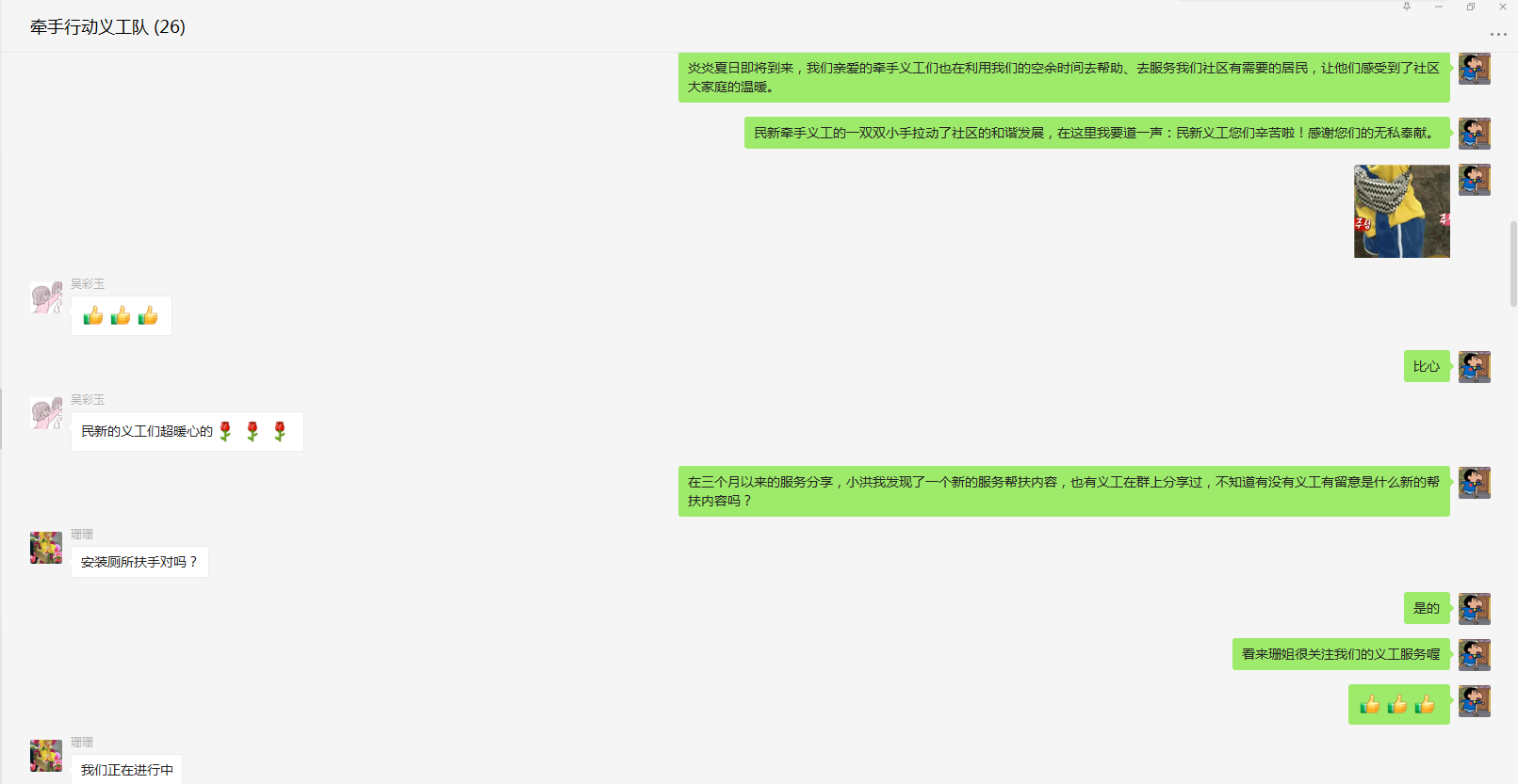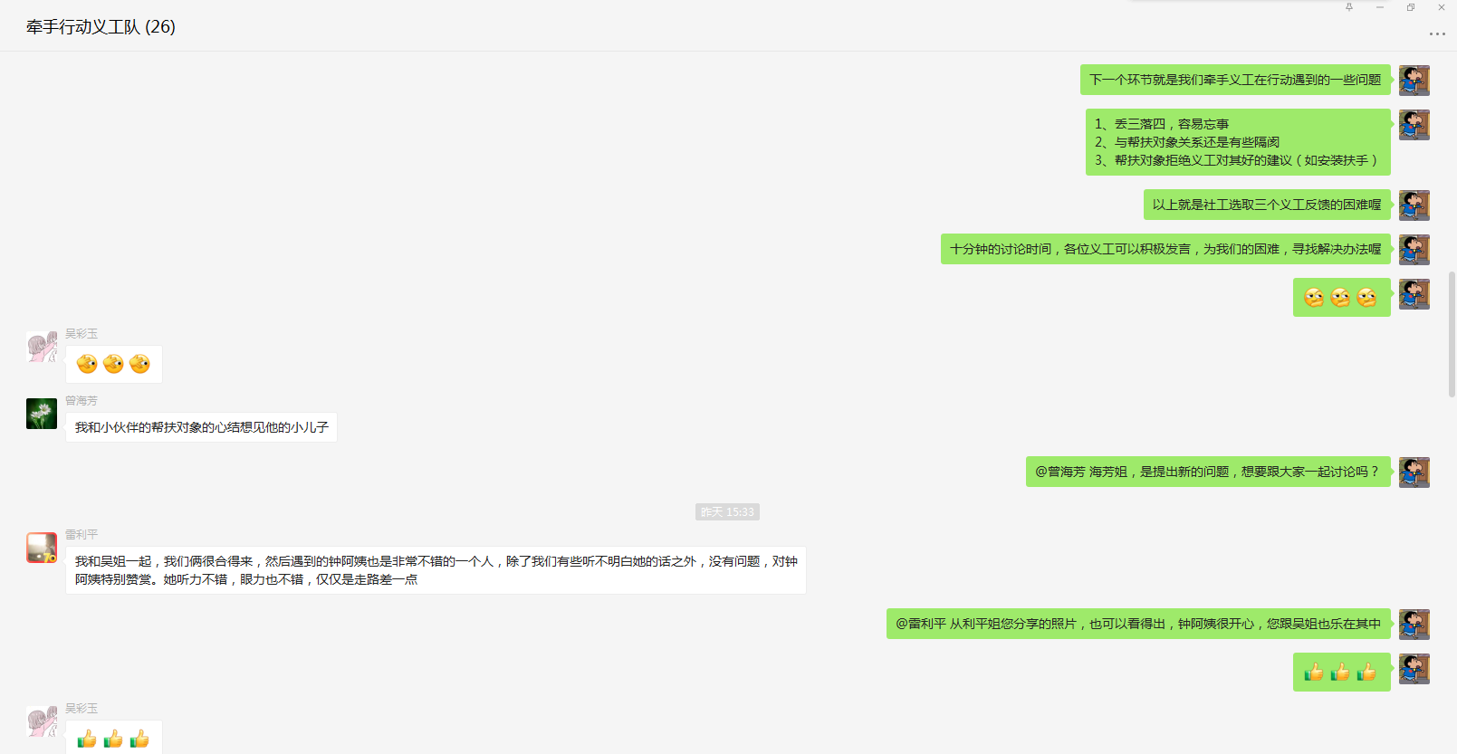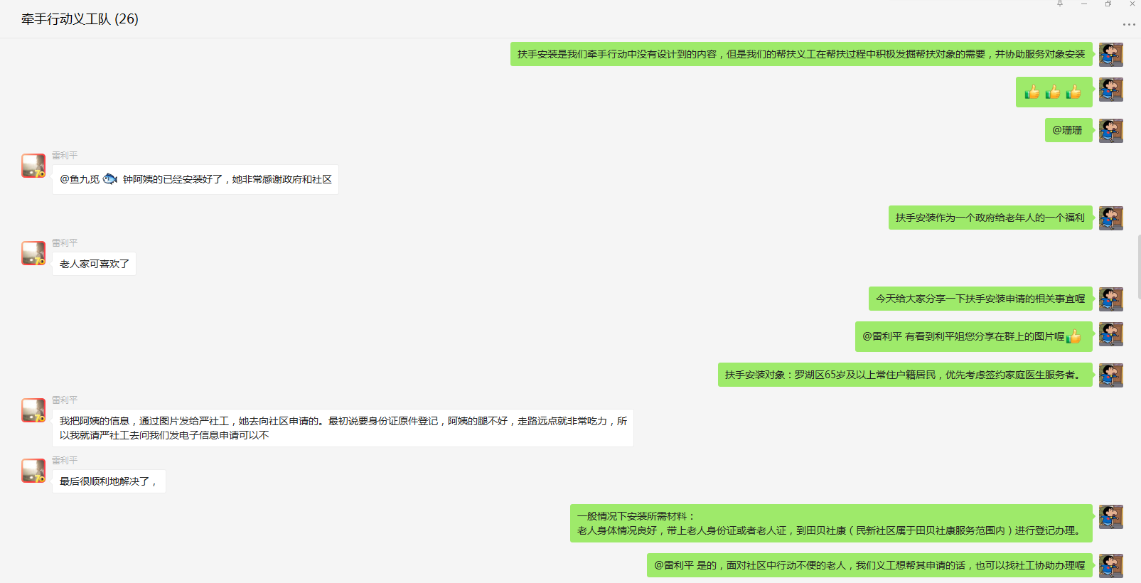 本次分享会中,社工通过牵手项目义工微信交流群与义工一起分享三月份的义工服务情况。大家认真回顾自己在过去一个月中的服务,脸上洋溢着自豪。互动分享环节,社工引导义工们发掘帮扶过程中的新变化,那就常住户籍老人可以到社康申请安装居家安全扶手,扶手安装作为深圳政府给老年人的一个福利,是牵手行动在一开始的计划中没有设计到的内容,但是我们的帮扶义工在帮扶过程中积极发掘帮扶对象的需要,并协助服务对象安装,使得帮扶对象拥有更加安全,更加舒适的生活环境。