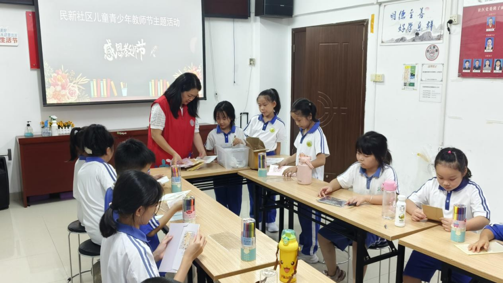 罗湖家园网讯:为深入推进“百千万工程”基层文化建设,丰富居民精神文化生活,培养社区儿童青少年用真挚的方式表达对教师的感恩与祝福之情,营造尊师重道、崇德向善的良好氛围。2025年9月5日下午,在民新社区党委的指导下,在党群服务中心活动室开展教师节主题活动,13位社区青少年积极参与,用创意与心意致敬老师。