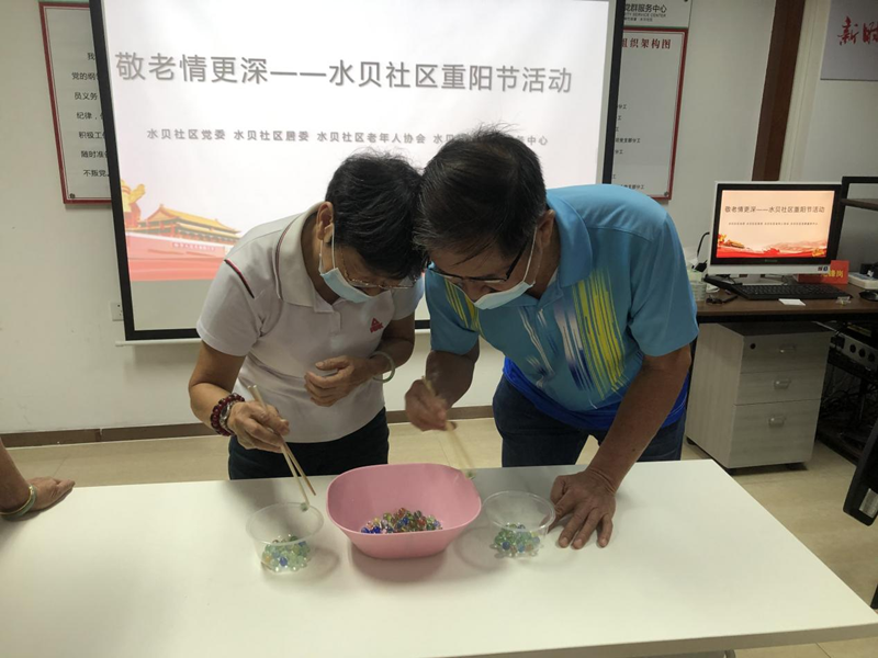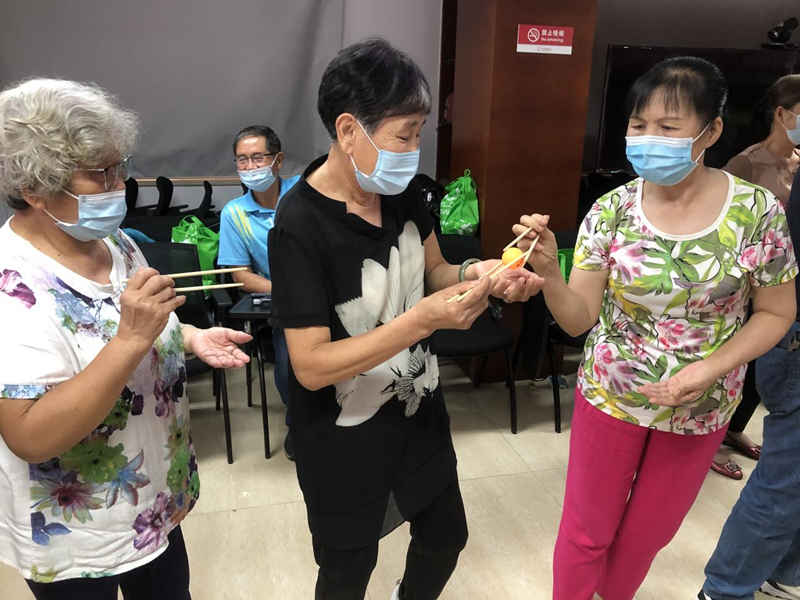活动开始长者们个个精神矍铄,都做好了活动开始前的热身准备,活动采用互动的趣味游戏拉近彼此的距离,“你比我猜”、“空运乒乓球”、“筷功无敌手”等游戏,引得长者们哈哈大笑,在“你比我猜”游戏中,陈叔叔手舞足蹈地比划着的“扭秧歌”题目,他扭出的俏皮,扭出的自信。游戏过后,长者们激情合唱《团结就是力量》,跌宕起伏的旋律,铿锵有力的声音,唱出了团结互助的精神。