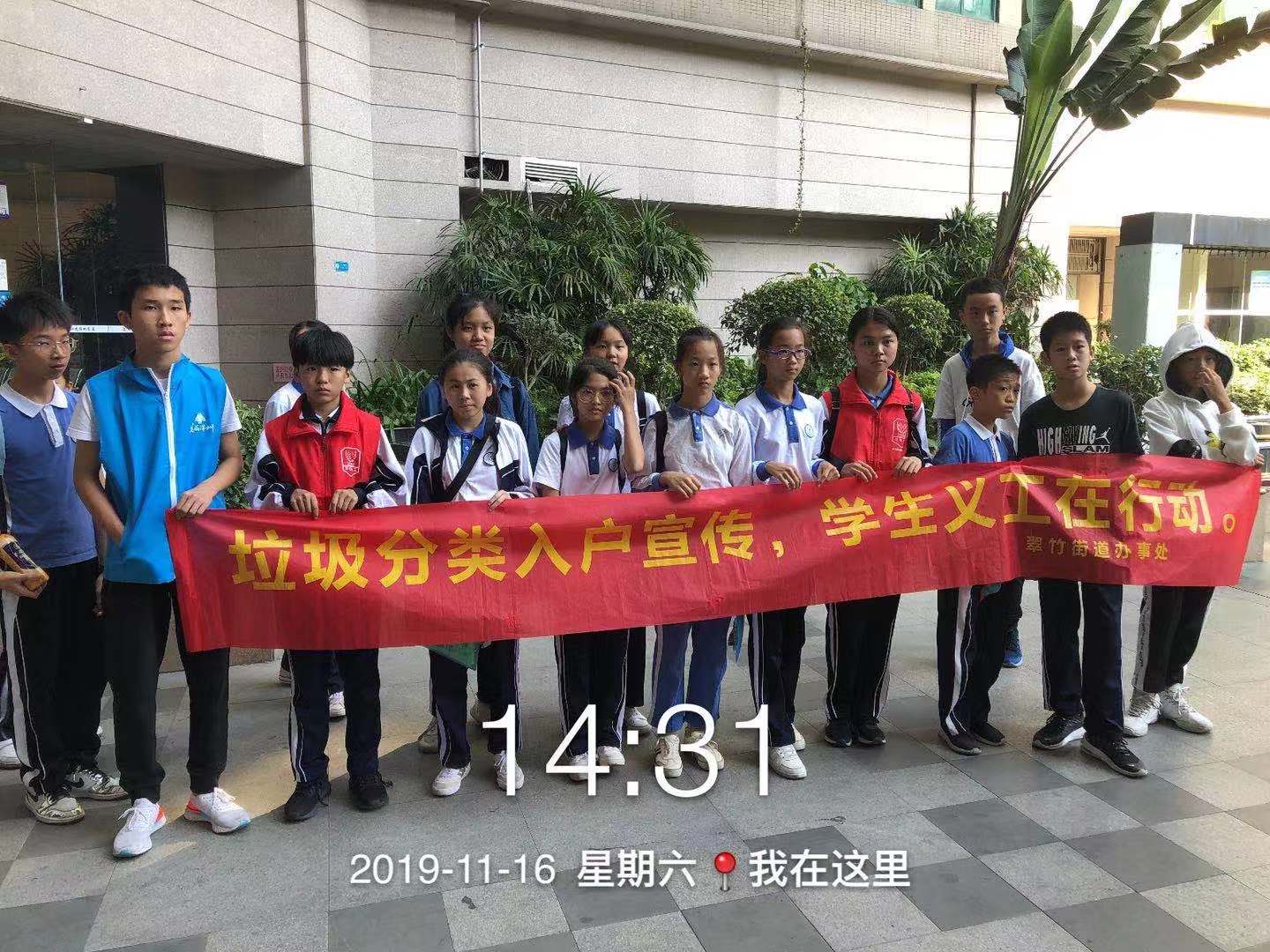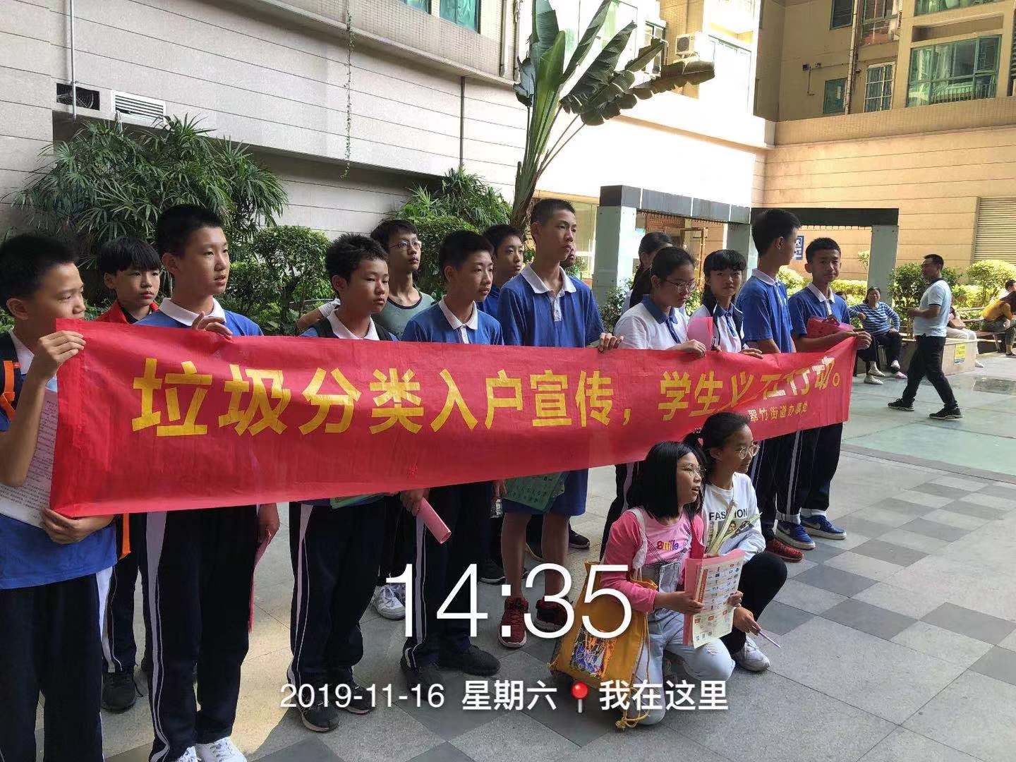 月16日,在阳光绿地高层住宅小区组织学生开展入户宣传垃圾分类活动。
