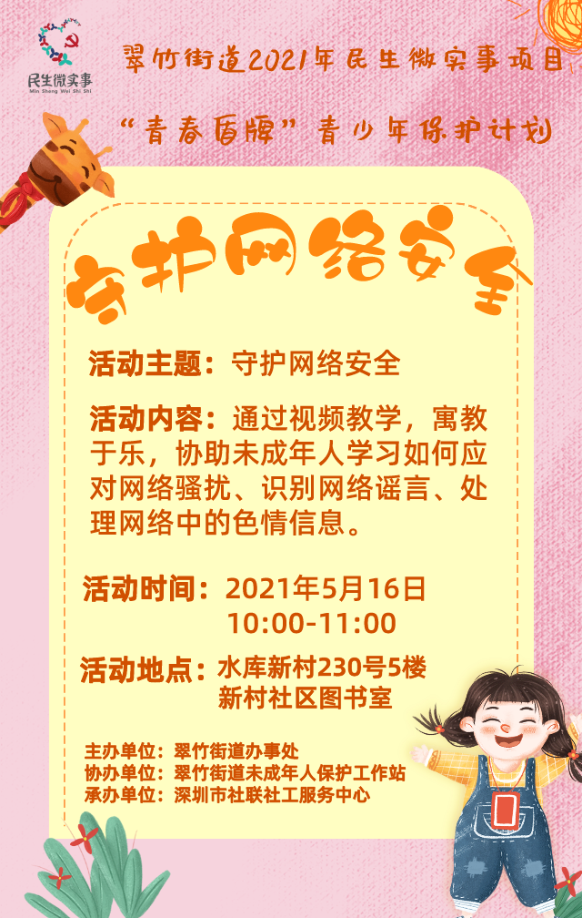 新村社区党委将于2021年5月16日(周天)开展守护网络安全活动,活动通过视频教学的方式,寓教于乐,协助未成年学习如何应对网络骚扰、识别网络谣言、处理网络中的色情,提高自我保护能力。欢迎社区居民的积极报名参与。