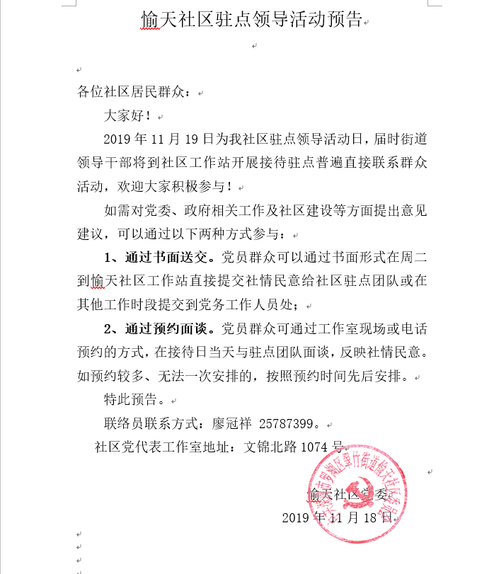 愉天社区2019年11月第三次驻点预告