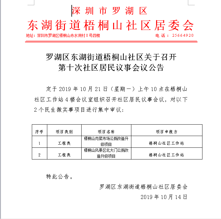 罗湖区东湖街道梧桐山社区关于召开第十次社区居民议事会议公告